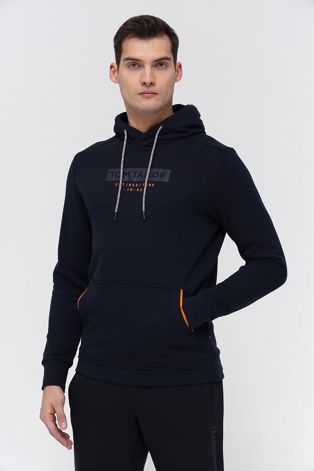 На груди расположена фирменная надпись Tom Tailor, выполненная в контрастном цвете, что придает толстовке стильный и узнаваемый вид. Небольшая оранжевая вставка на кармане добавляет акцент. Толстовка изготовлена из высококачественного 100% хлопка, что обеспечивает мягкость, приятные тактильные ощущения и долговечность изделия.