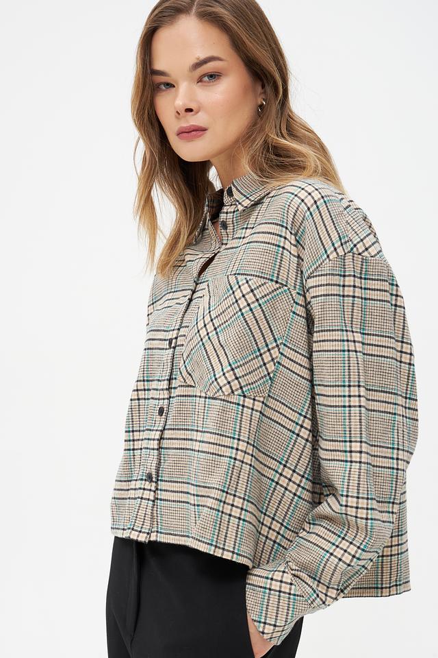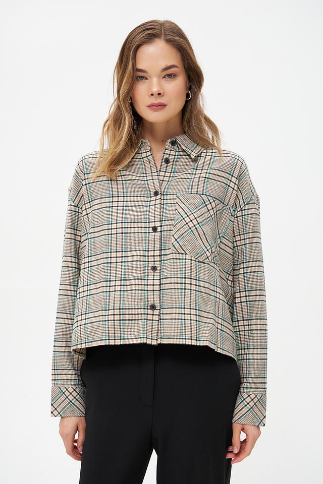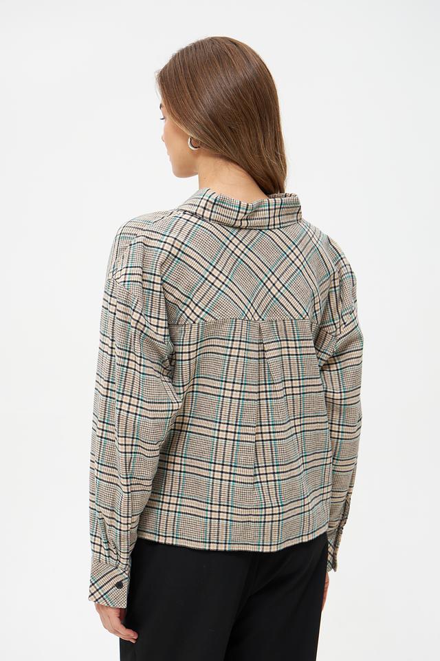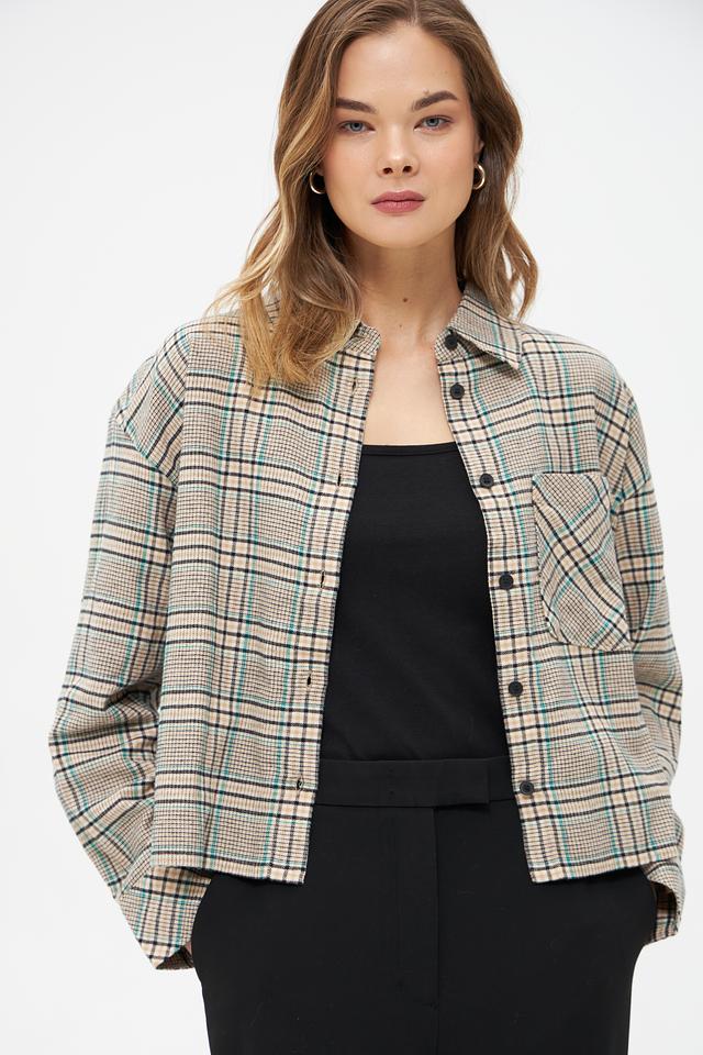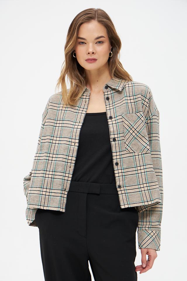 Жакет имеет рубашечный крой с отложным воротником и застежкой на пуговицы. На груди расположен накладной карман с клапаном, также выполненный в клетку. Длинные рукава дополняют образ.