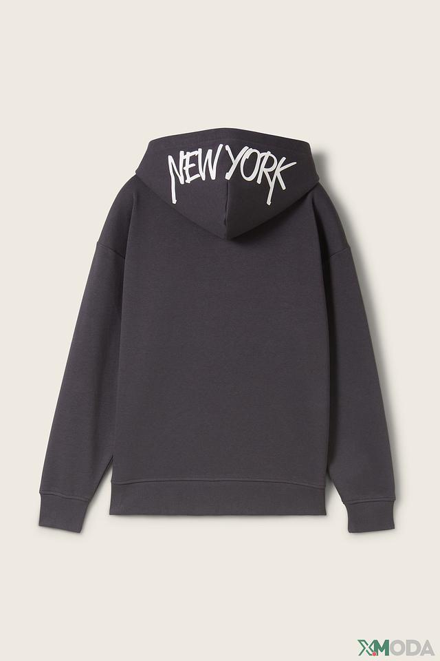 Свитшот имеет капюшон, украшенный яркой надписью "NEW YORK", что придает ему стильный и современный вид. На передней части расположился вместительный карман-кенгуру, который идеально подходит для хранения мелочей или согревания рук.
