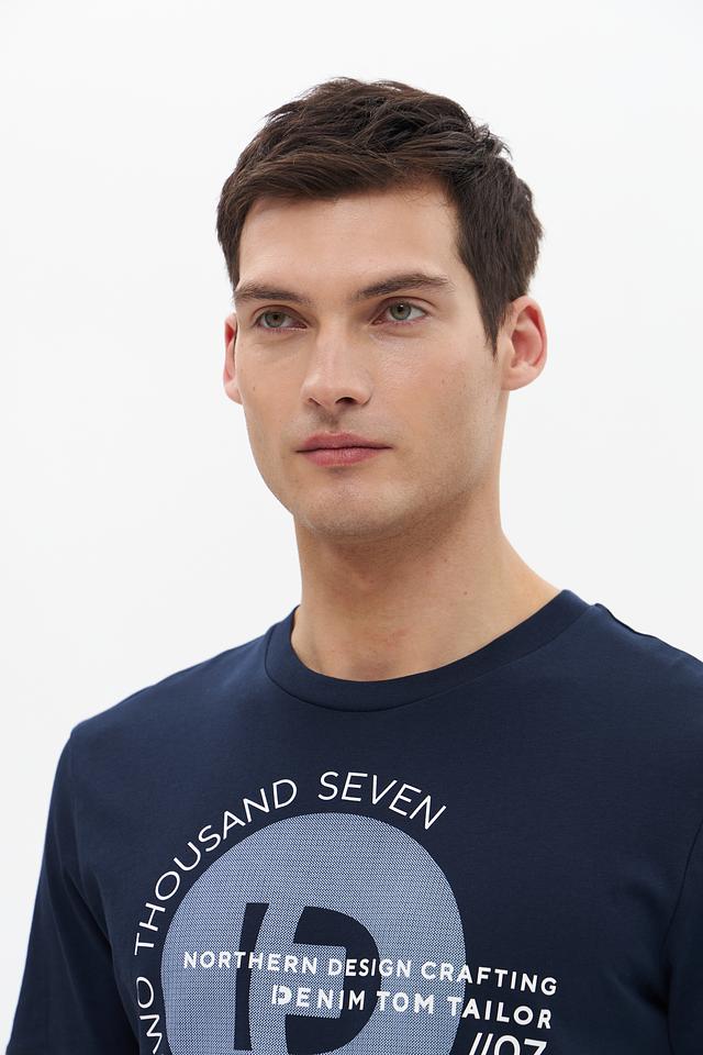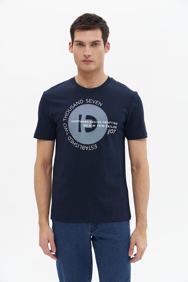 Основным акцентом является круглый принт на груди, выполненный в белом и сером цветах с добавлением красных акцентов. Принт содержит надписи "NORTHERN DESIGN CRAFTING DENIM TOM TAILOR" и "ESTABLISHED //07", что придает футболке стильный и современный вид.