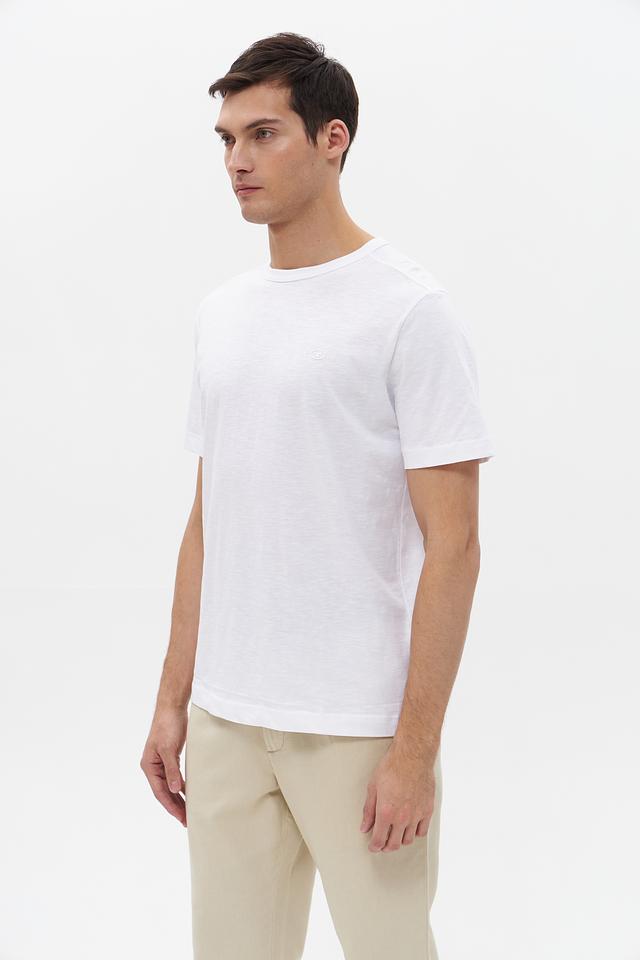 Футболка имеет круглый вырез горловины и короткие рукава. Минималистичный дизайн с небольшим логотипом бренда на груди делает ее универсальной для создания различных образов. Белый цвет легко сочетается с другими элементами гардероба.