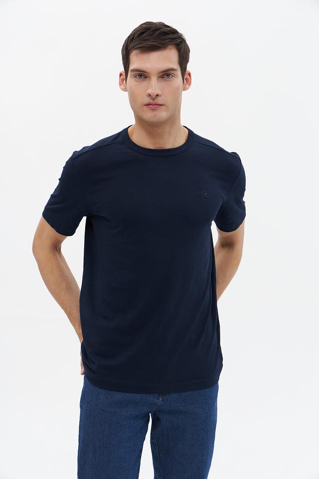 Цвет футболки – насыщенный тёмно-синий (navy), что делает её легко сочетаемой с различными элементами гардероба. На груди расположена небольшая вышивка с логотипом бренда, добавляющая футболке стильный акцент.