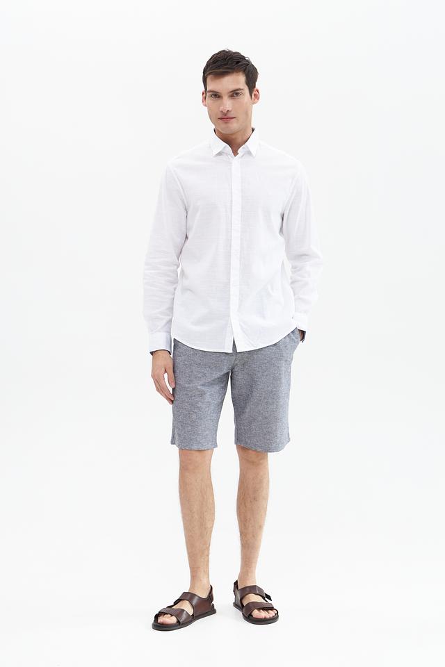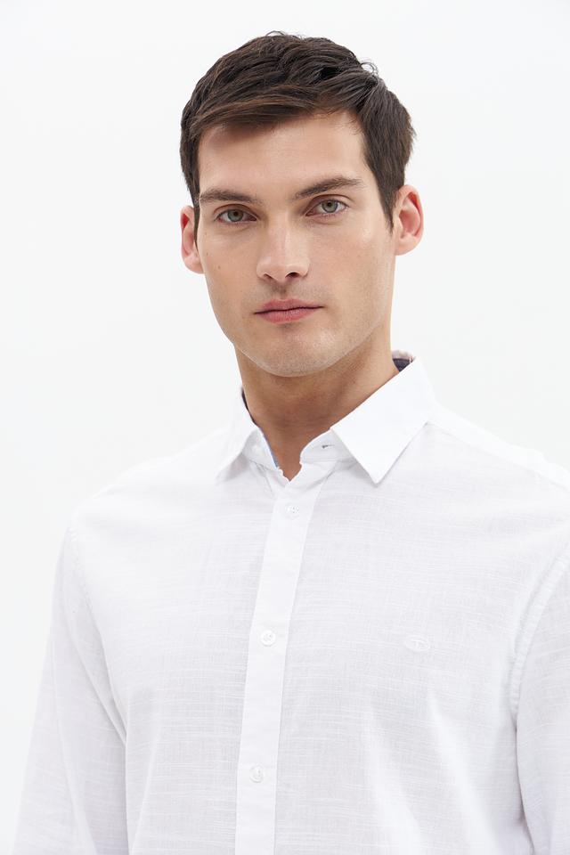 Рубашка имеет стандартную посадку, воротник классической формы и застёжку на пуговицы. Текстура ткани придает рубашке лёгкую небрежность и стильный вид. Белый цвет делает эту рубашку универсальной и легко сочетаемой с другими элементами одежды.