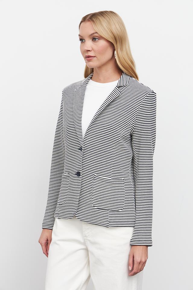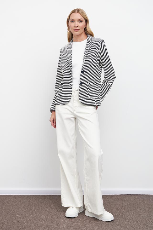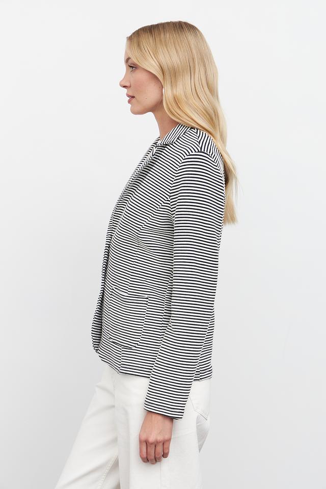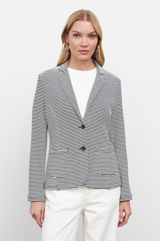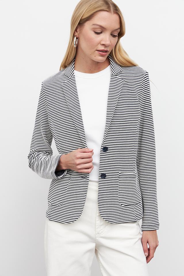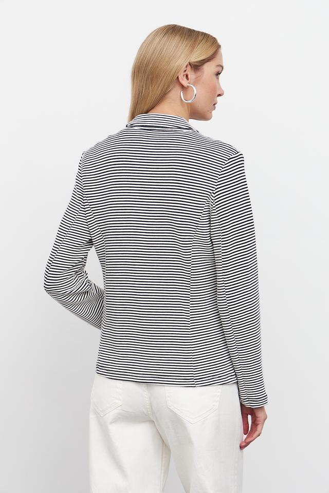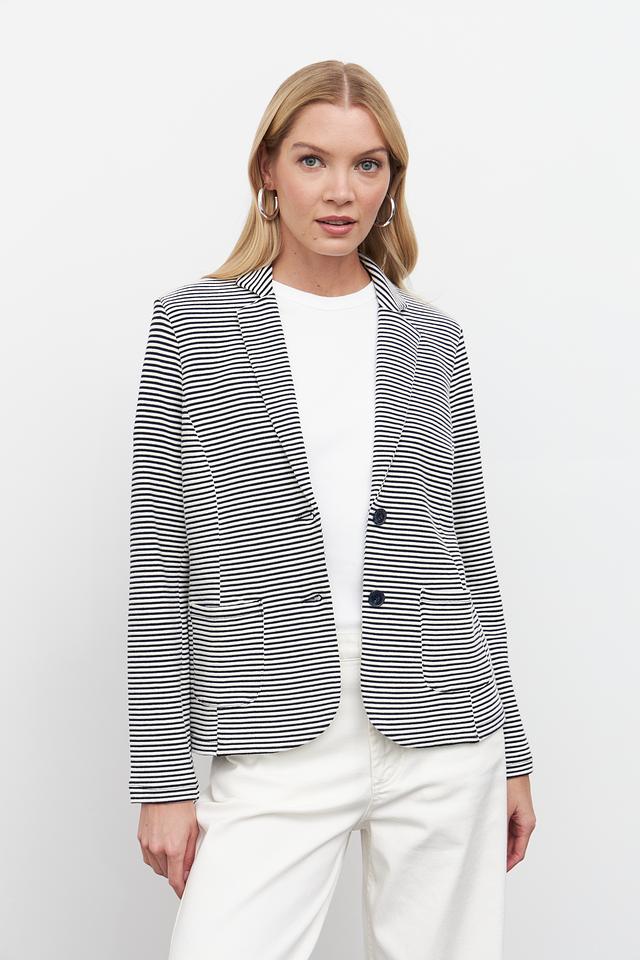 Жакет имеет полосатую расцветку – сочетание синего и белого цветов, что делает его универсальным и легко сочетаемым с различными элементами одежды. Застежка на пуговицах обеспечивает надежную фиксацию.