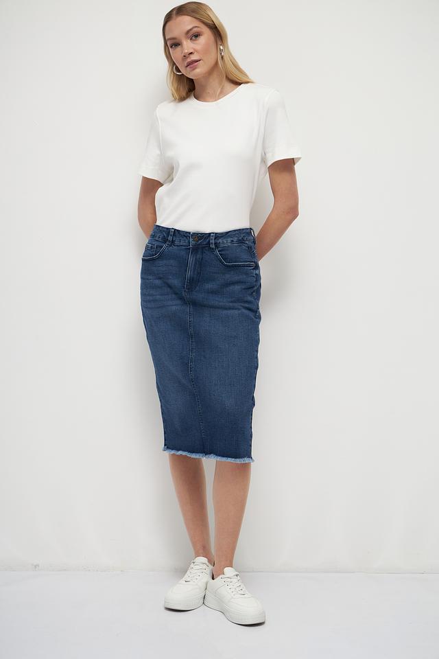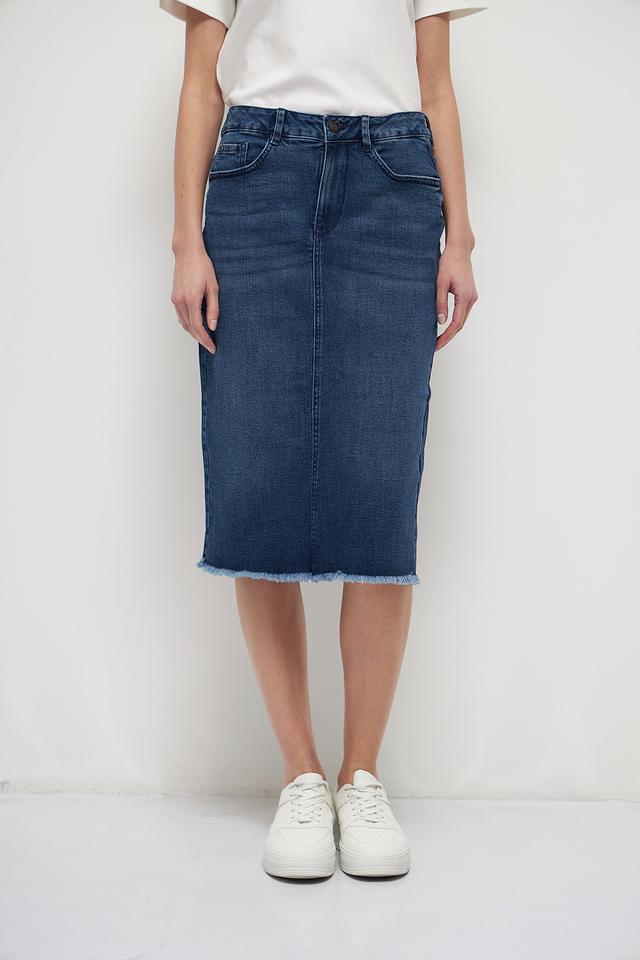 Модель имеет классический джинсовый крой с пятью карманами и необработанный край подола, что придает ей современный и слегка небрежный вид. Юбка идеально сочетается с футболками, топами и свитерами, а также с кедами, кроссовками или босоножками.