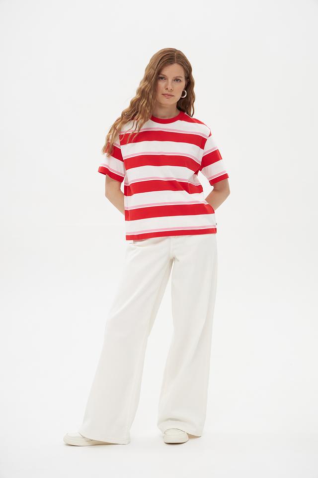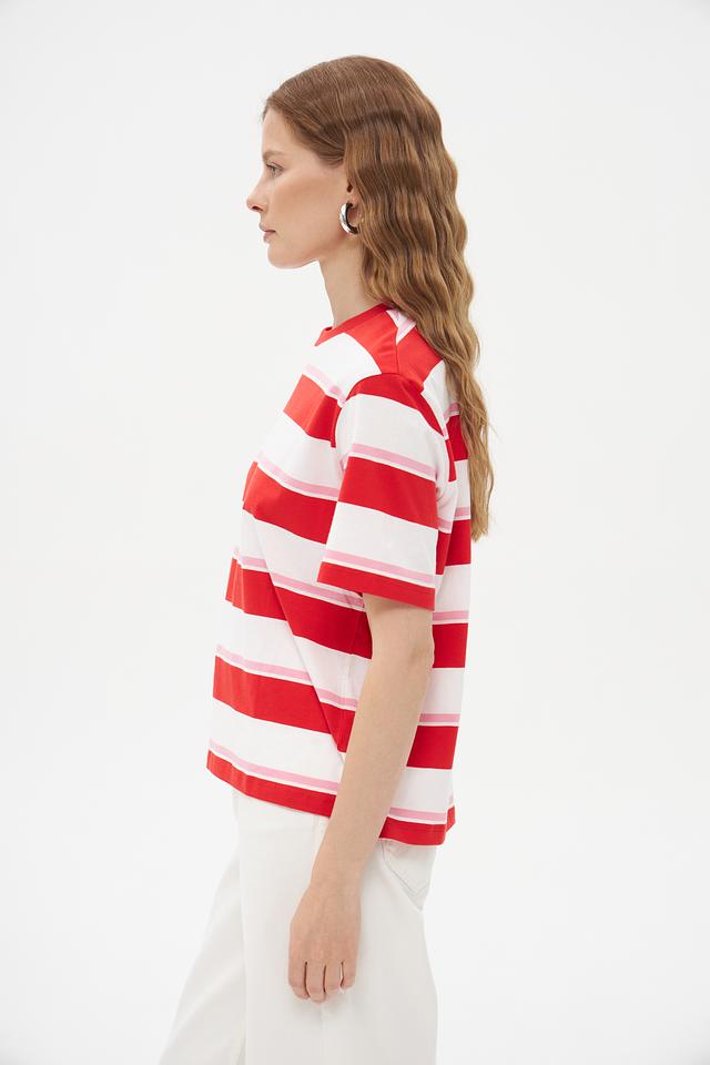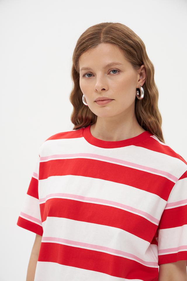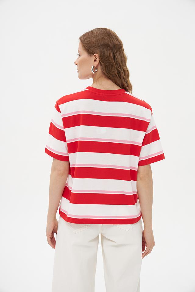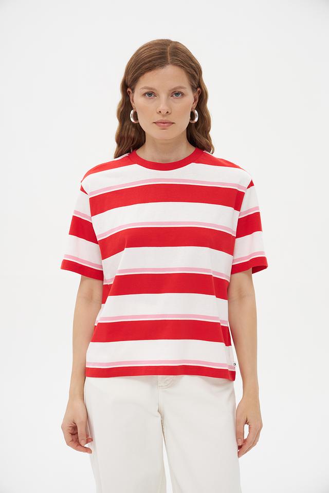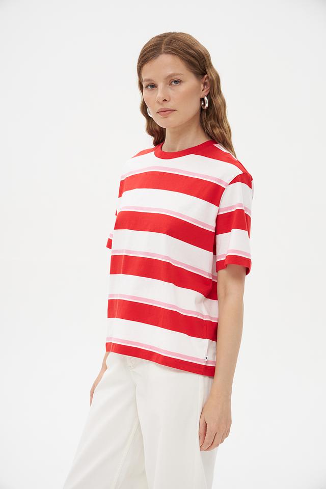 Женская футболка Tom Tailor красного цвета с ярким полосатым принтом. Изготовлена из 100% хлопка, обеспечивающего комфорт и воздухопроницаемость. Стильный и универсальный вариант для повседневного образа. Состав: хлопок 100%