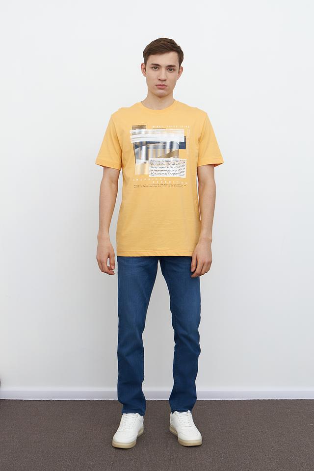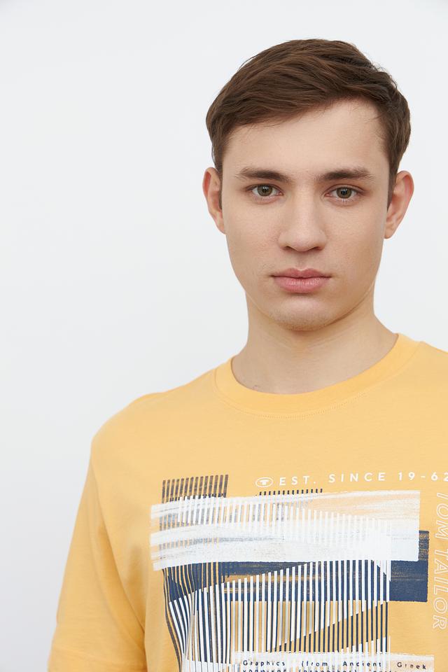 Мужская футболка Tom Tailor горчичного цвета с оригинальным графическим принтом. Изготовлена из 100% хлопка, обеспечивающего комфорт и воздухопроницаемость. Состав: хлопок 100%