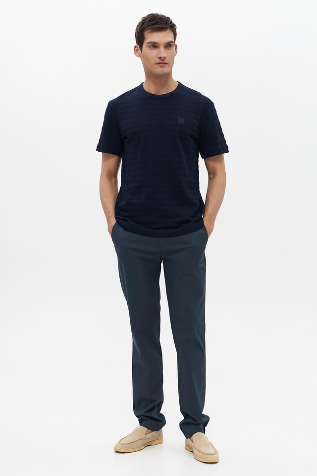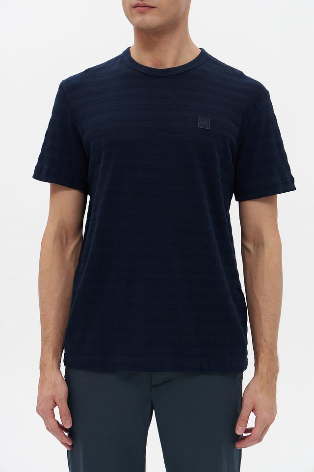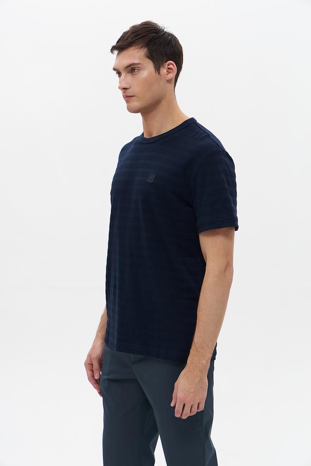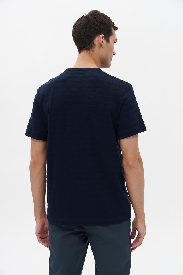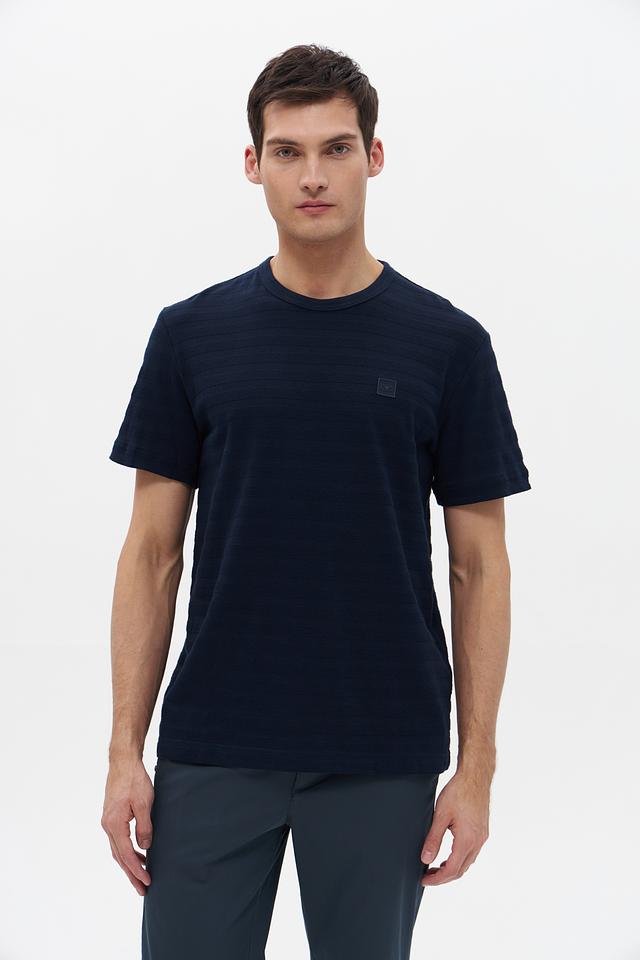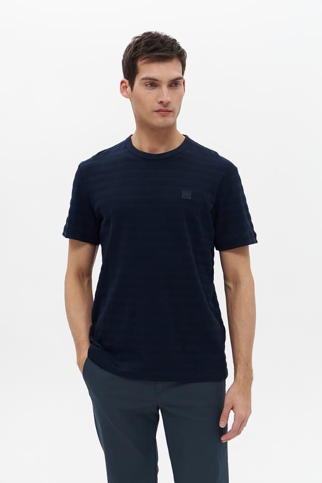 Мужская футболка Tom Tailor тёмно-синего цвета с полосатой текстурой и круглым вырезом горловины. Изготовлена из 100% хлопка, обеспечивающего комфорт и воздухопроницаемость. Стильный и универсальный вариант для повседневного образа. Состав: хлопок 100%