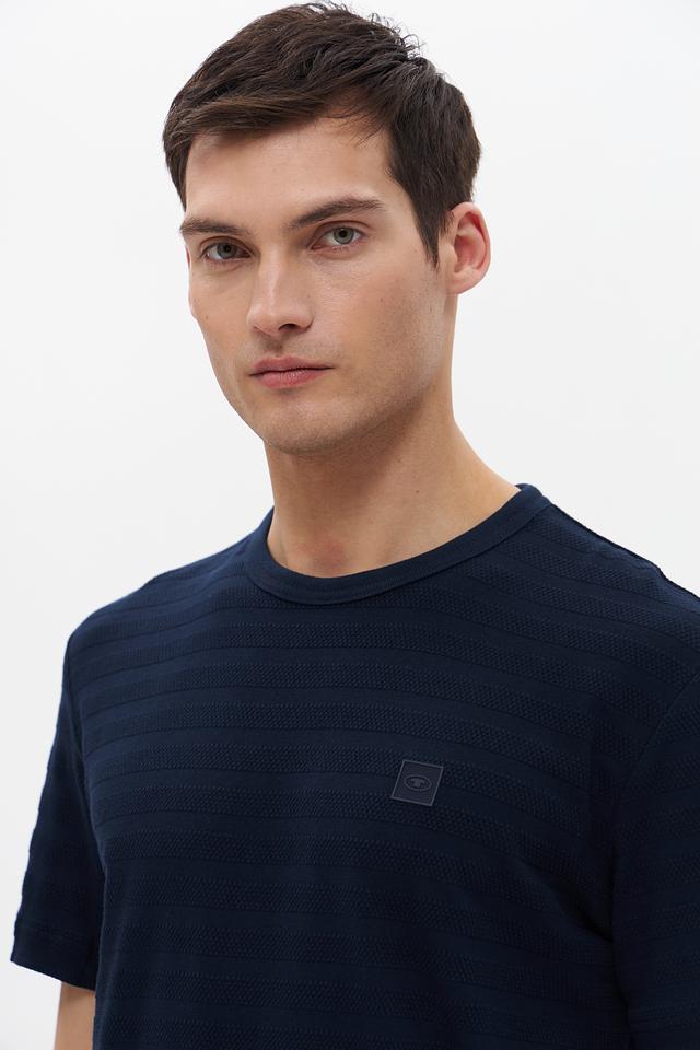 Эта мужская футболка от Tom Tailor выполнена в тёмно-синем цвете и отличается оригинальной полосатой текстурой. Модель имеет классический крой с короткими рукавами и круглым вырезом горловины, что делает её удобной и практичной для повседневной носки.