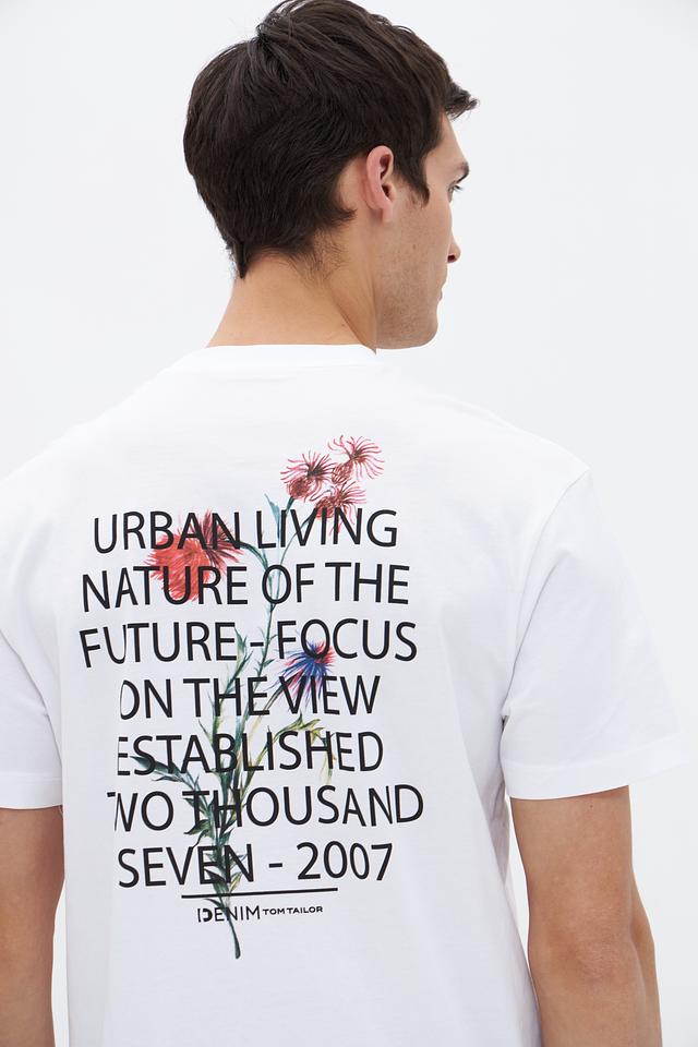 Футболка имеет классический прямой крой, который подходит для любого типа фигуры. На груди расположен небольшой принт с логотипом бренда и надписью "DENIM", а на спине – более крупный графический принт с надписями и изображением цветка.