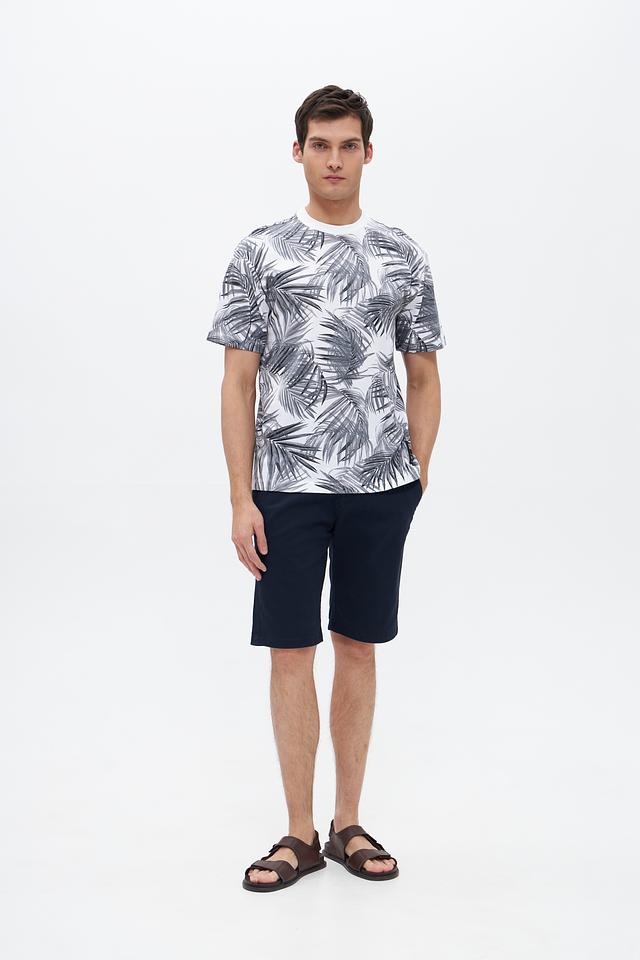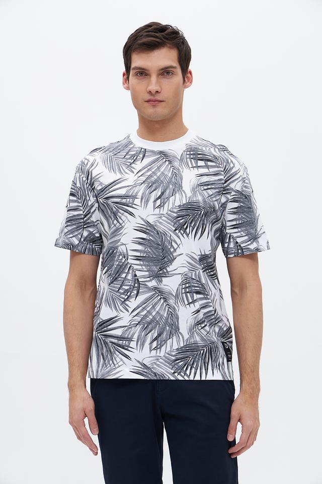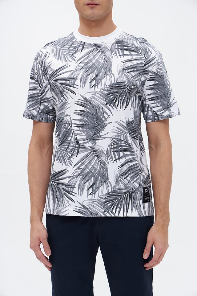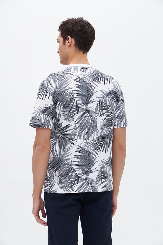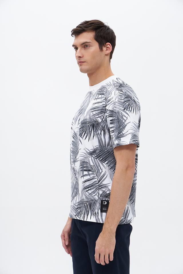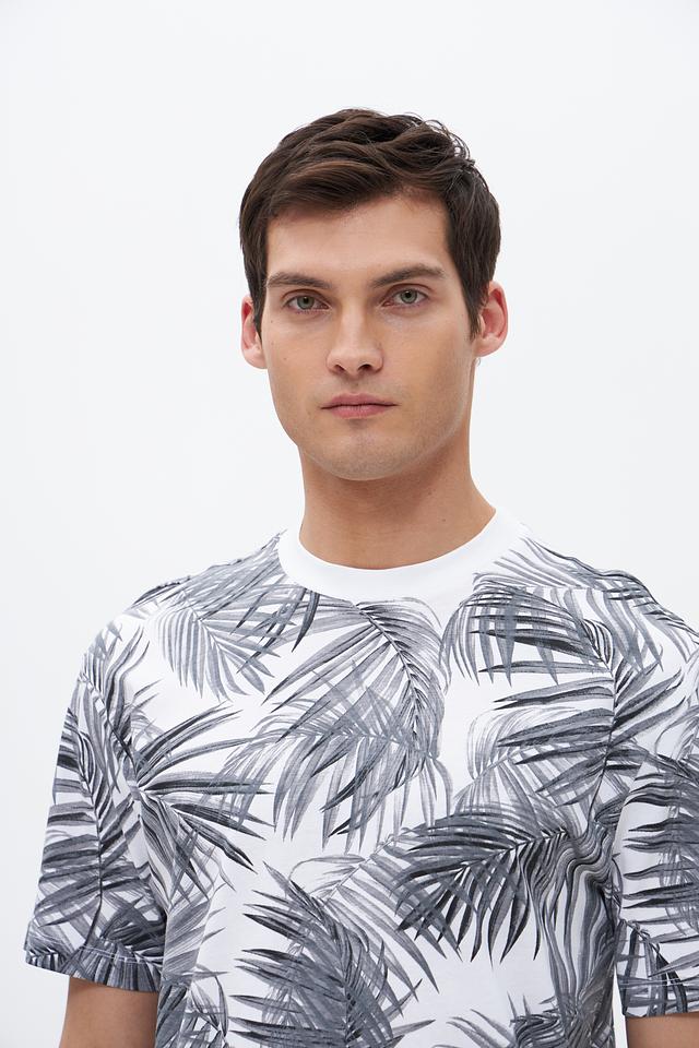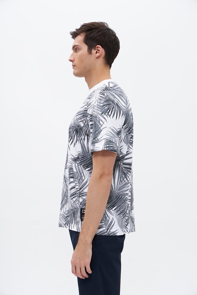 Основной цвет футболки – белый, а главным акцентом является эффектный принт с изображением листьев пальмы в различных оттенках серого. Такой рисунок придаёт футболке свежий и непринуждённый вид.