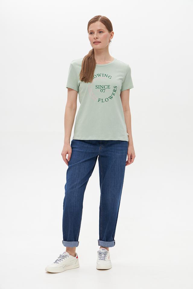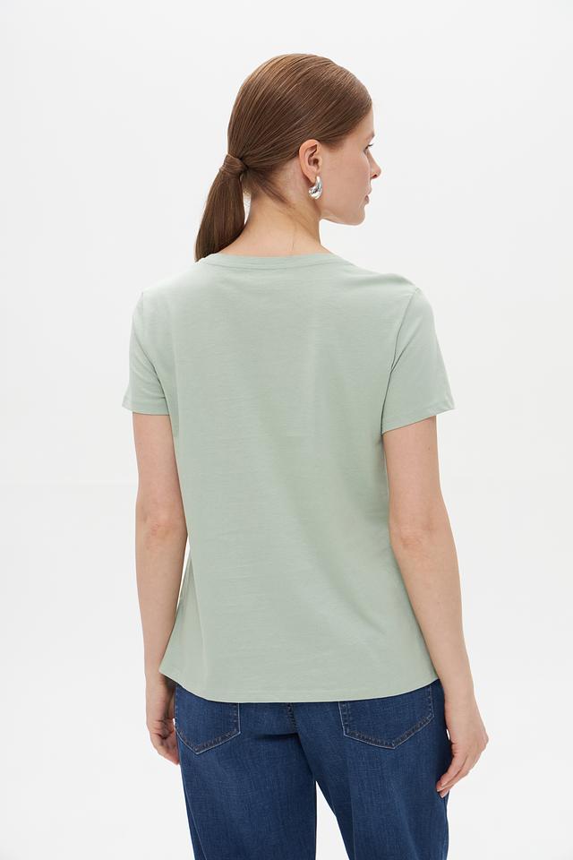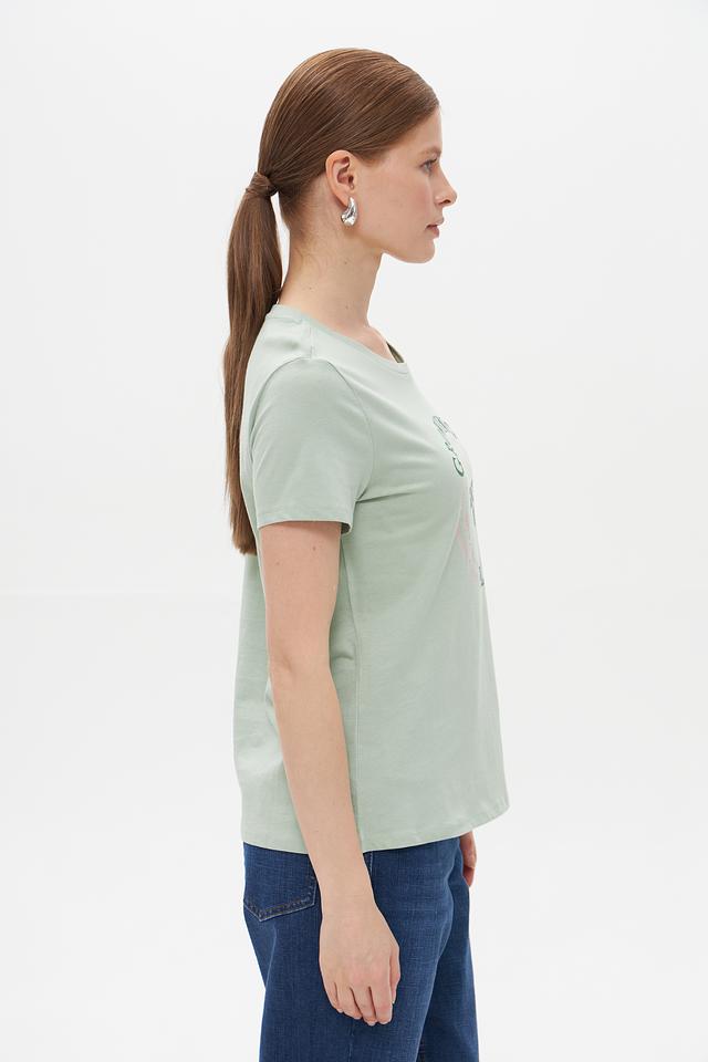Мятный цвет футболки освежает образ и придает ему легкость. Эта модель идеально подойдет для создания повседневных, непринужденных образов. Она станет незаменимой вещью в вашем гардеробе в теплое время года.