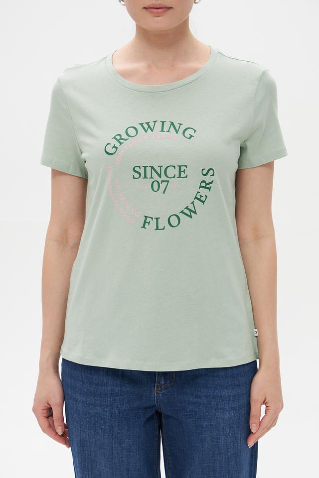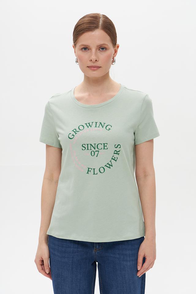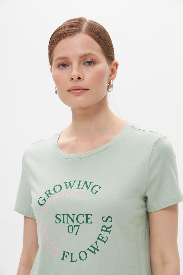 Футболка имеет классический прямой крой и короткие рукава. Особенностью модели является оригинальный принт с надписью "GROWING SINCE 07 FLOWERS", выполненный в тон изделия. Благодаря своему лаконичному дизайну, эта футболка легко сочетается с различными элементами одежды – джинсами, шортами, юбками.