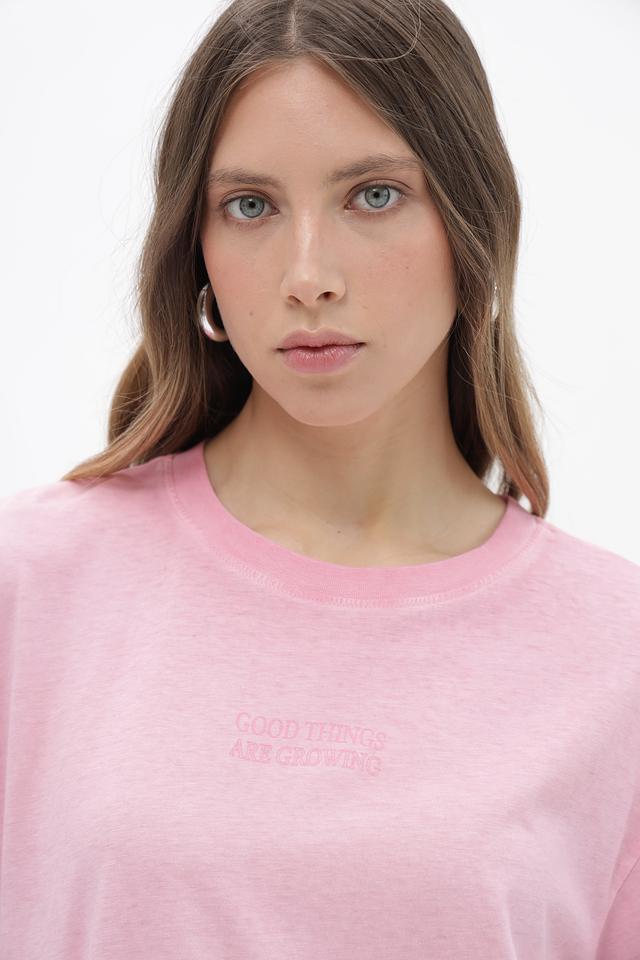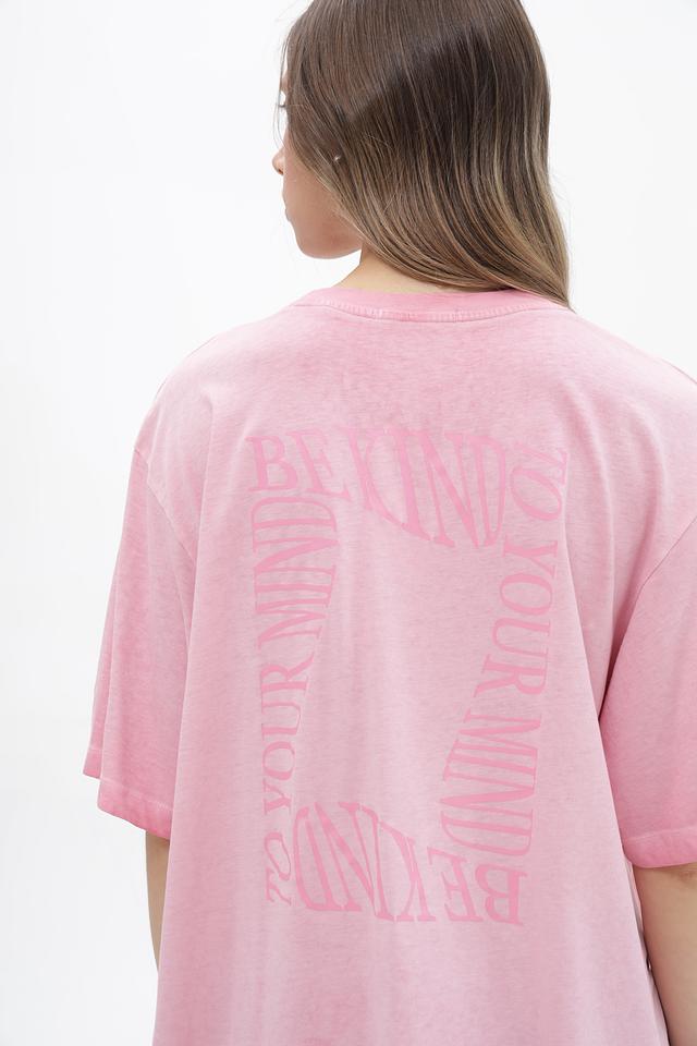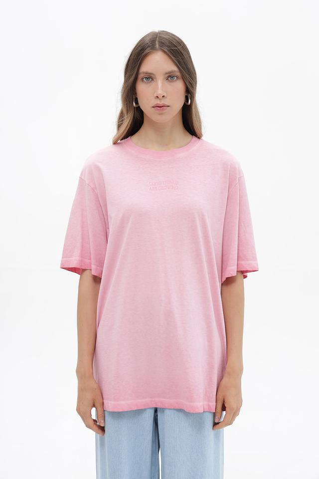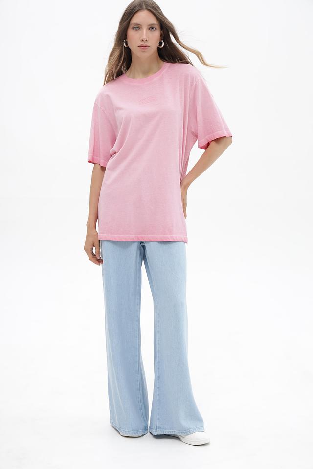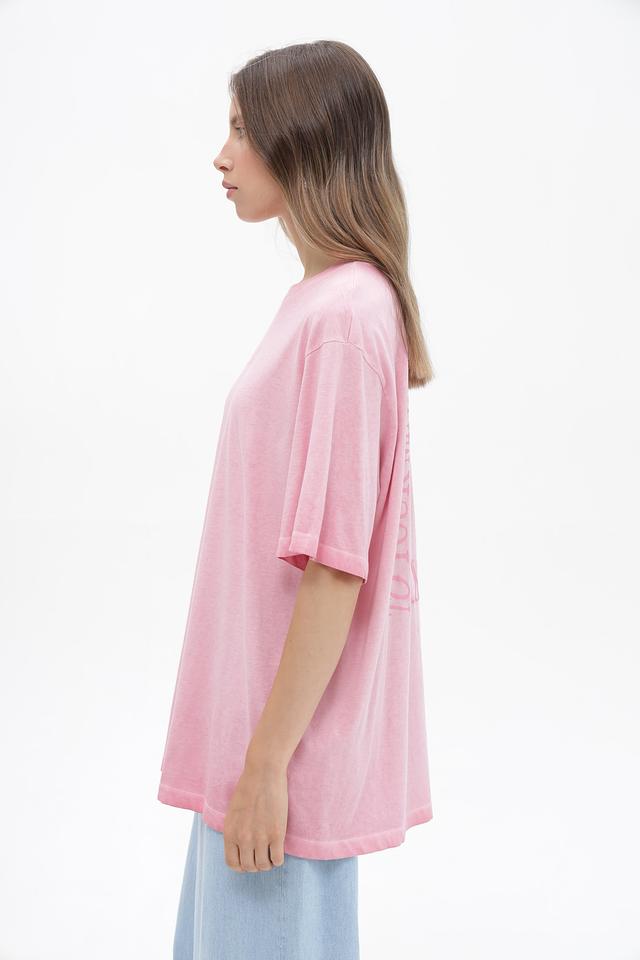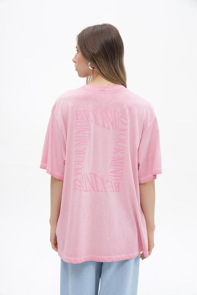 Футболка имеет свободный, oversize крой, который позволяет чувствовать себя свободно и непринужденно. Розовый цвет придает образу легкость и свежесть. На передней и задней части футболки расположен оригинальный принт с надписями.