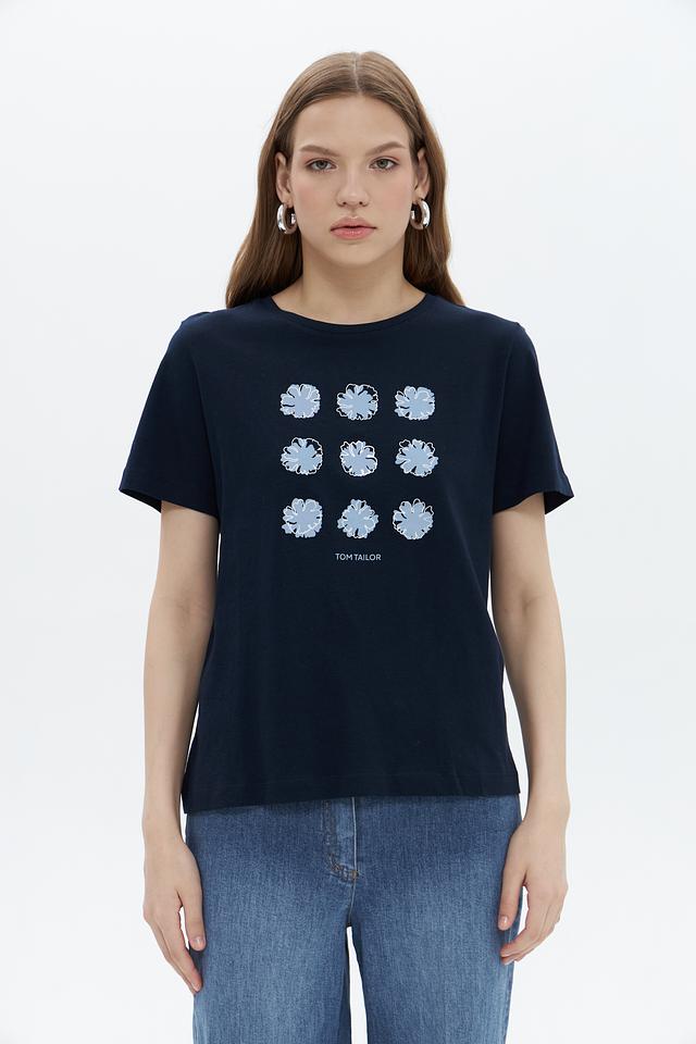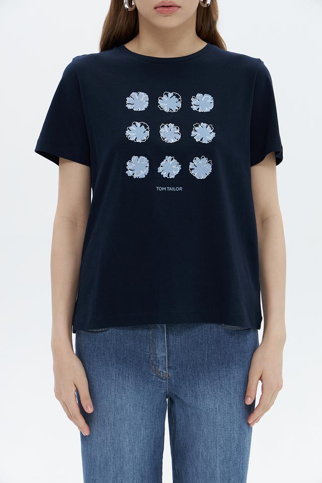 Женская футболка Tom Tailor темно-синего цвета с цветочным принтом – стильный и комфортный выбор для повседневного гардероба. Изготовлена из 100% хлопка, обеспечивающего приятные ощущения на коже. Состав: хлопок 100%