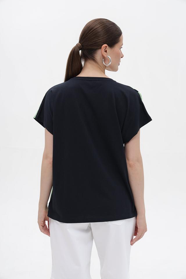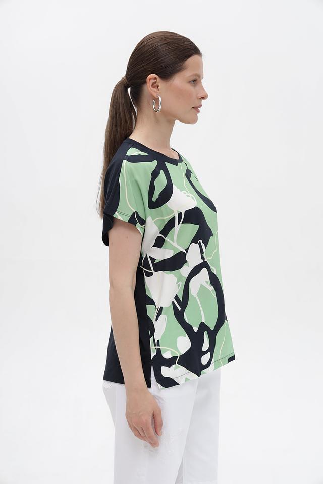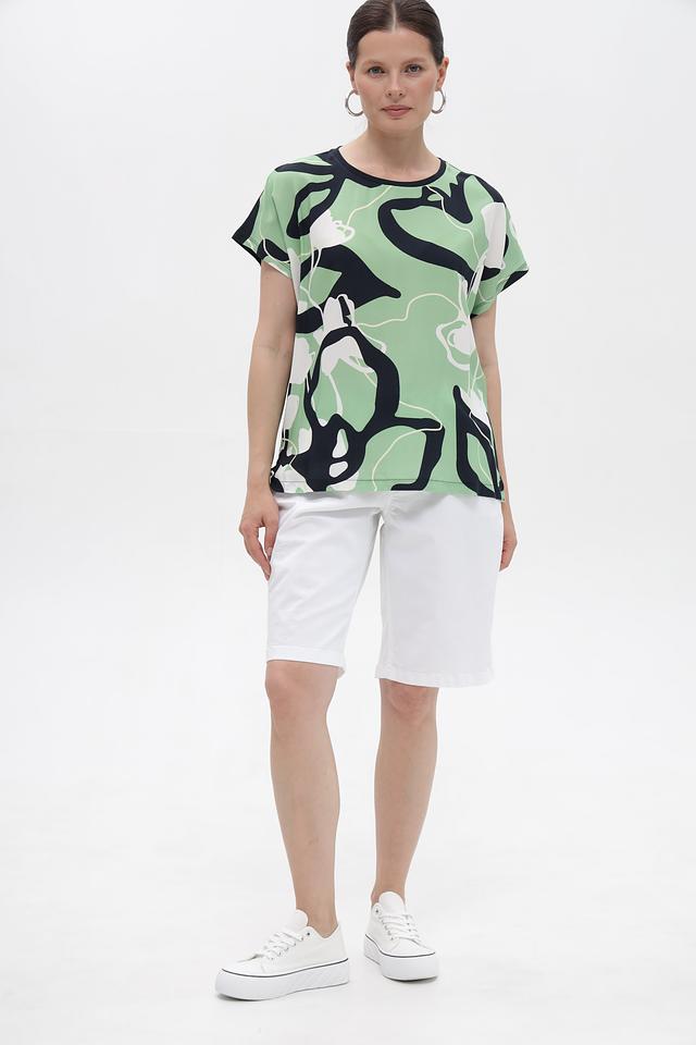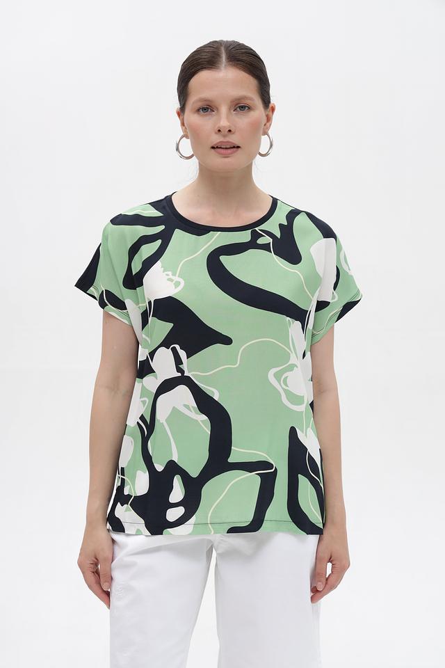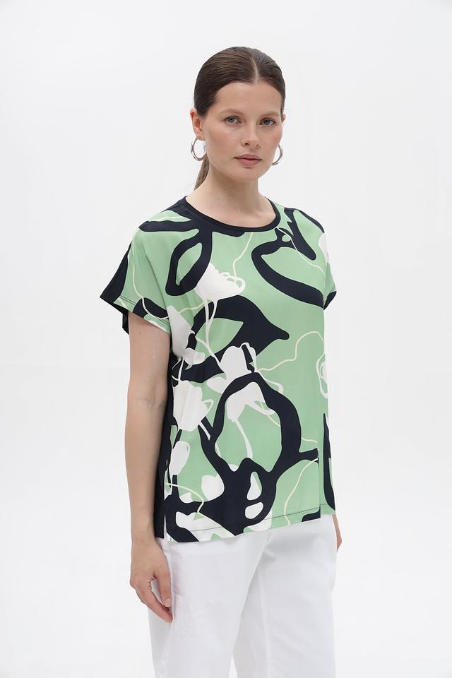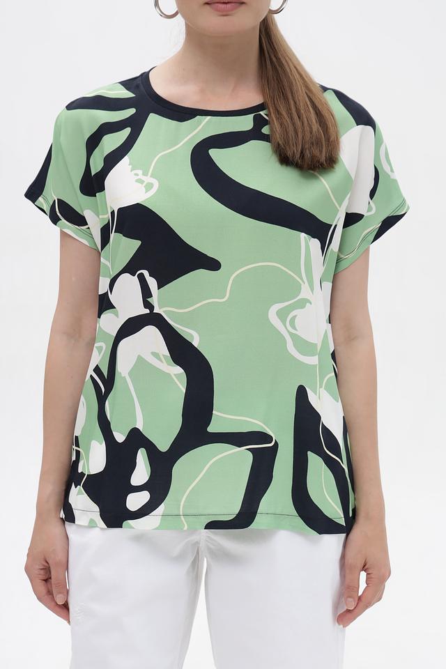 Блуза имеет свободный крой, короткие рукава и округлый вырез горловины. Главная особенность модели – яркий и необычный принт в абстрактном стиле, выполненный в зеленых, белых и черных тонах.