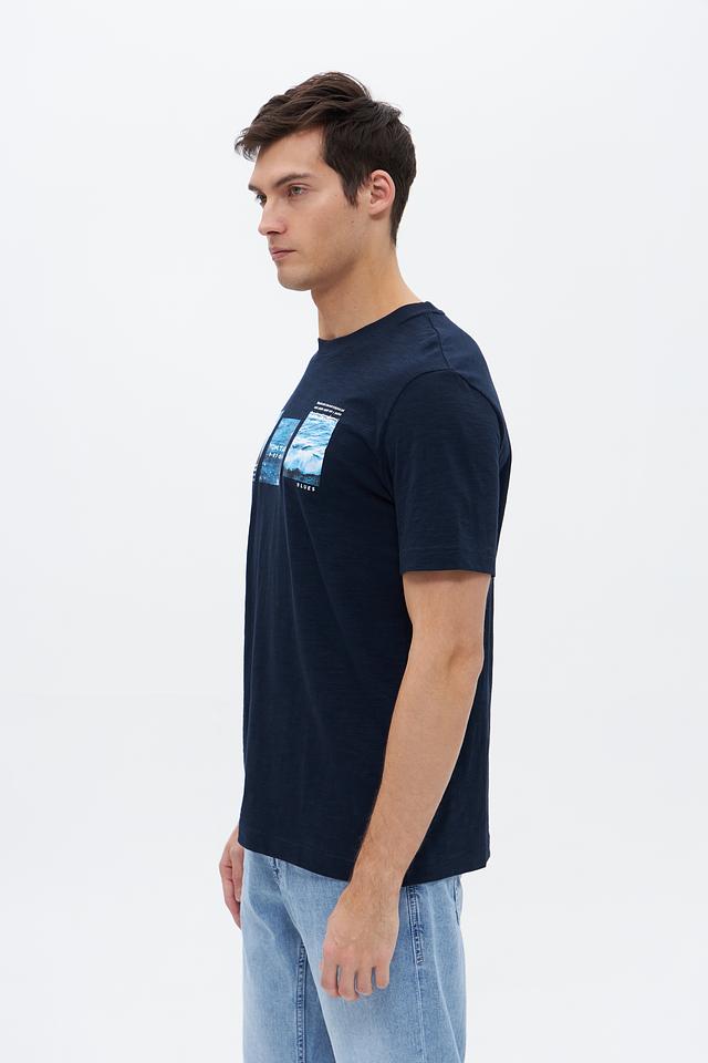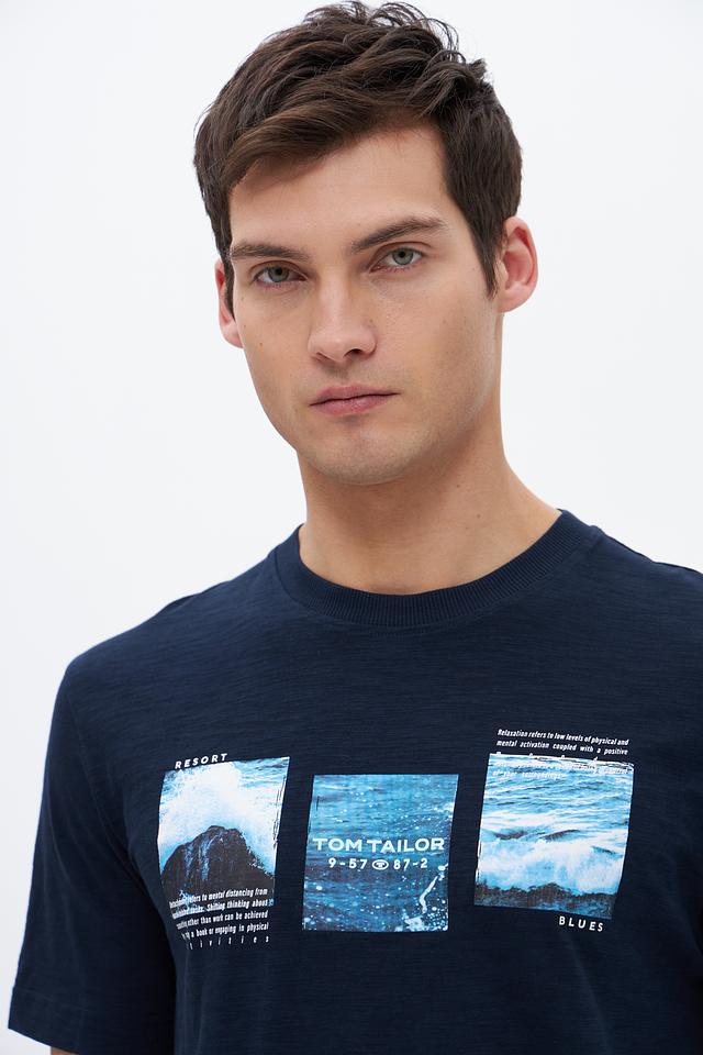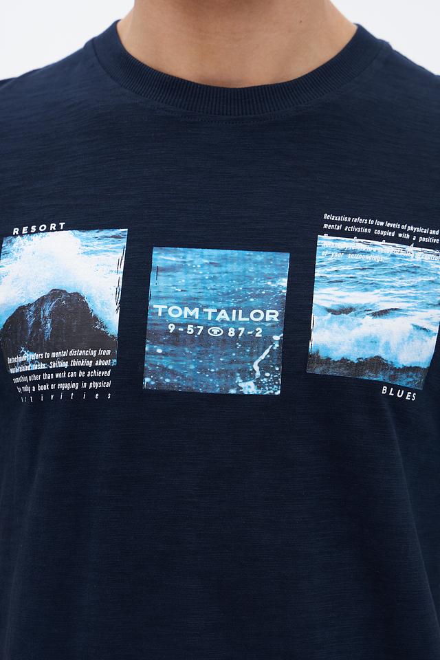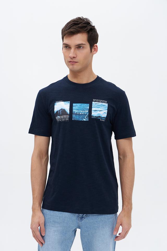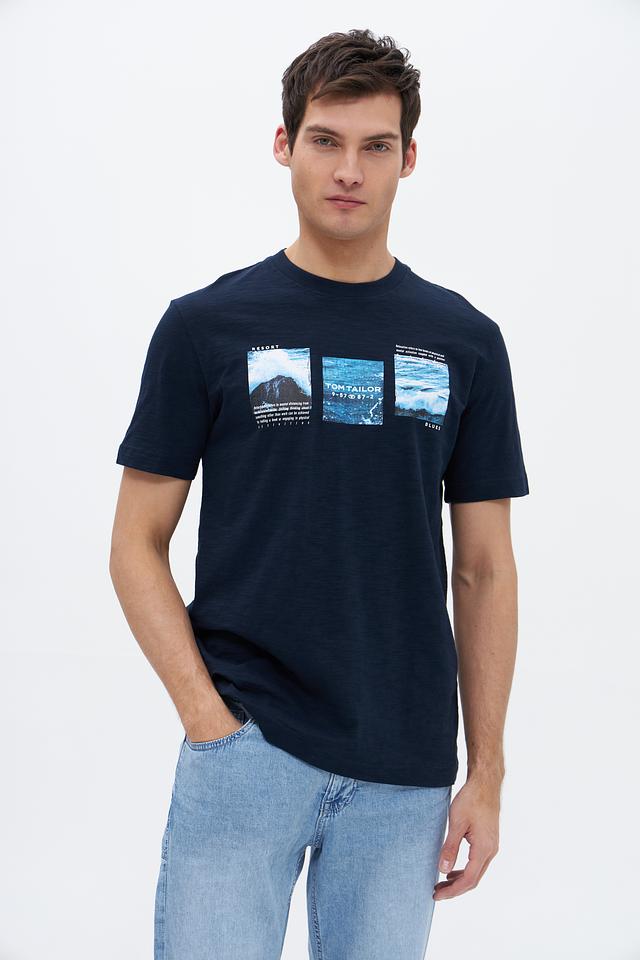 Мужская футболка Tom Tailor тёмно-синего цвета с ярким принтом в виде пейзажей. Изготовлена из 100% хлопка, обеспечивающего комфорт и воздухопроницаемость. Стильный и удобный вариант для повседневной носки. Состав: хлопок 100%