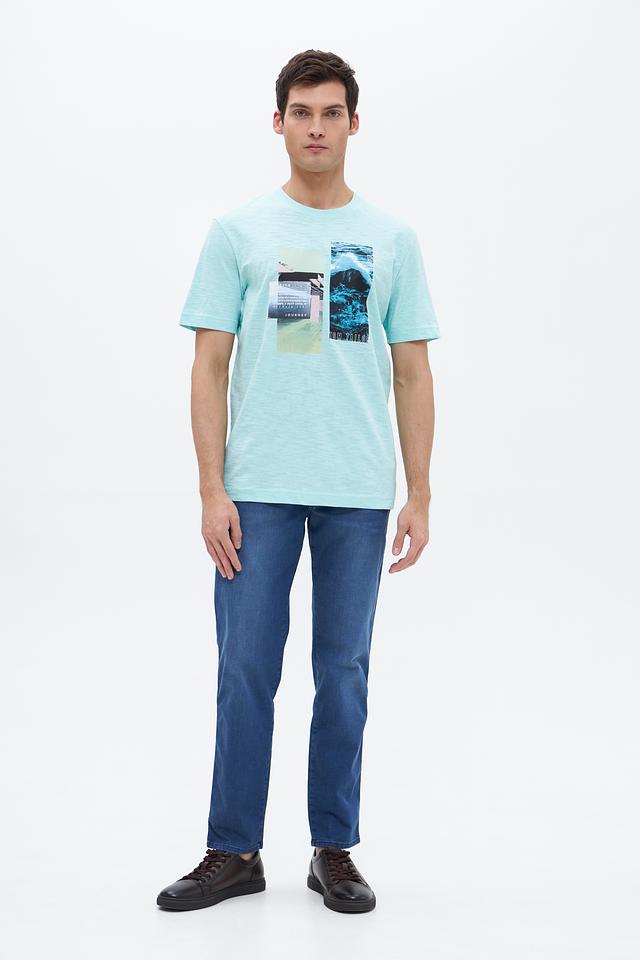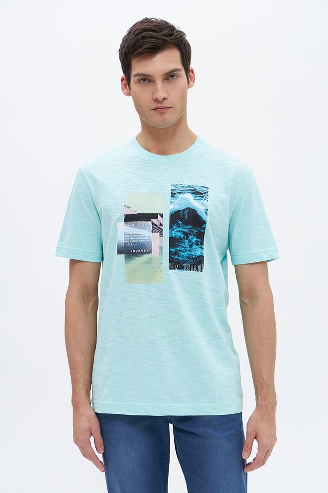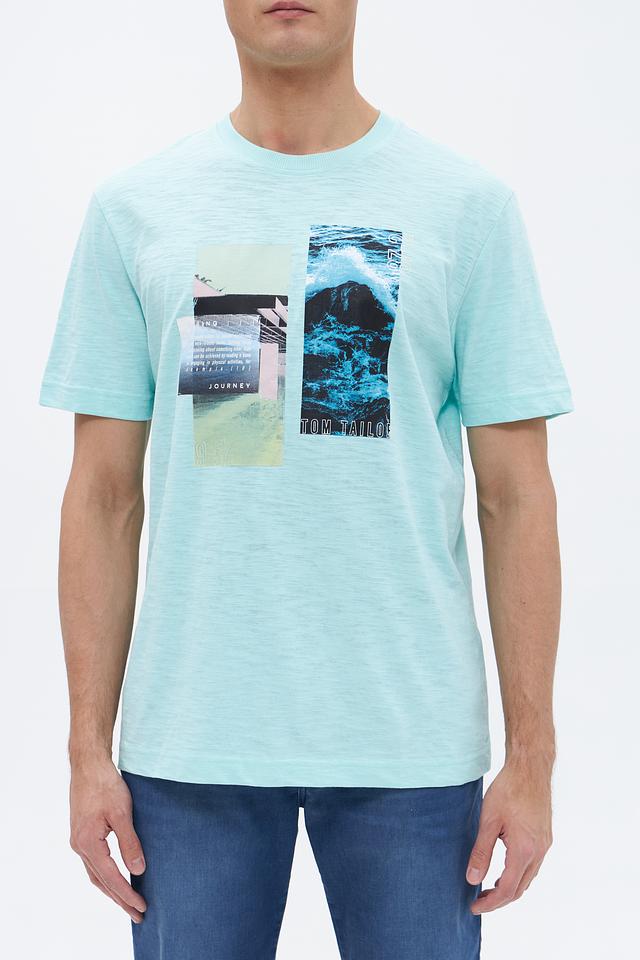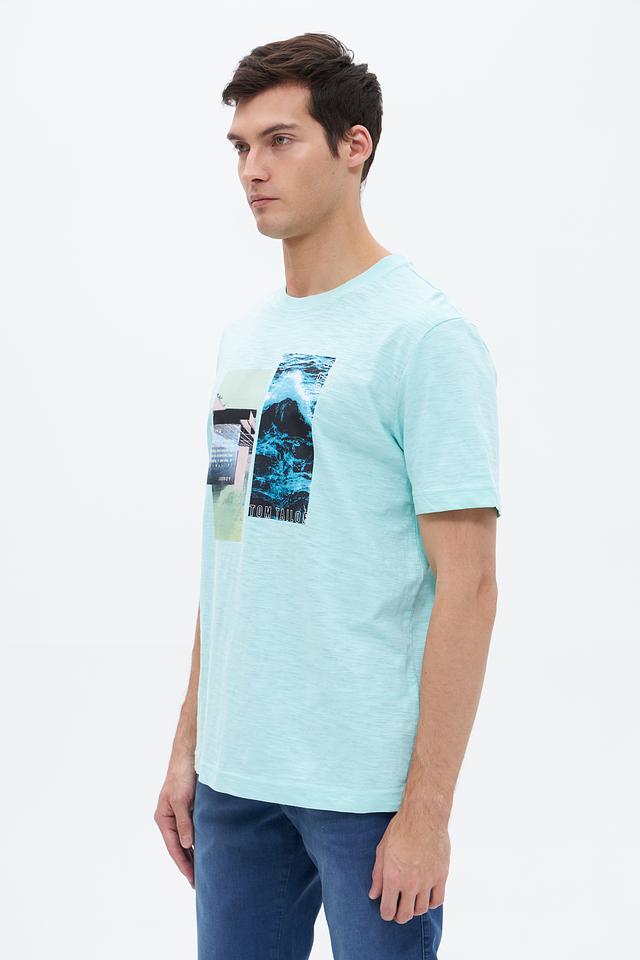 Мужская футболка Tom Tailor мятного цвета с оригинальным графическим принтом. Изготовлена из 100% хлопка, обеспечивающего комфорт и воздухопроницаемость. Стильный и удобный выбор для повседневного образа. Состав: хлопок 100%