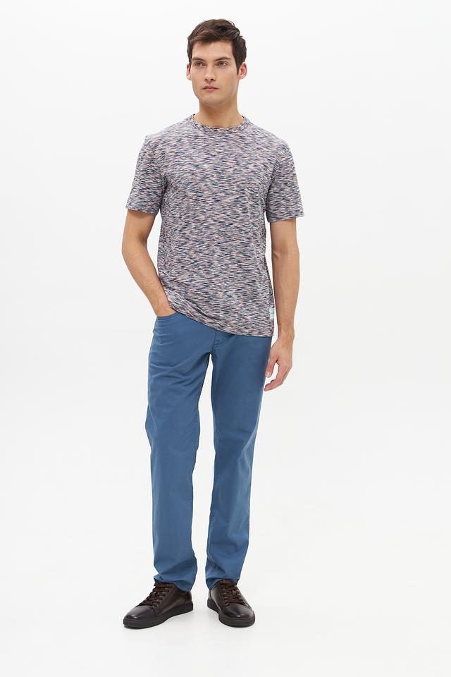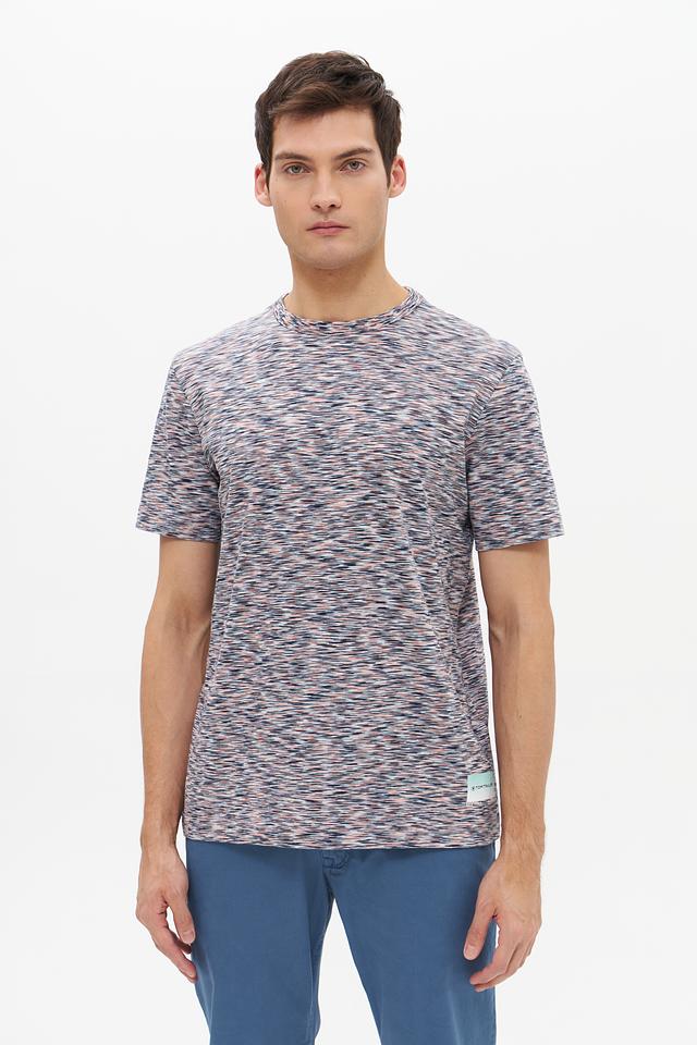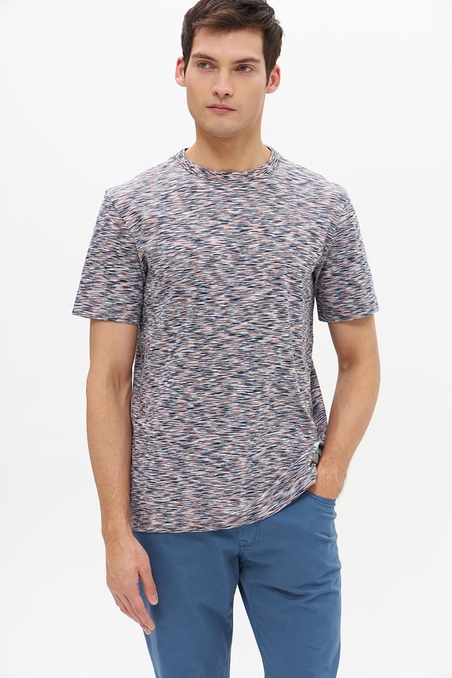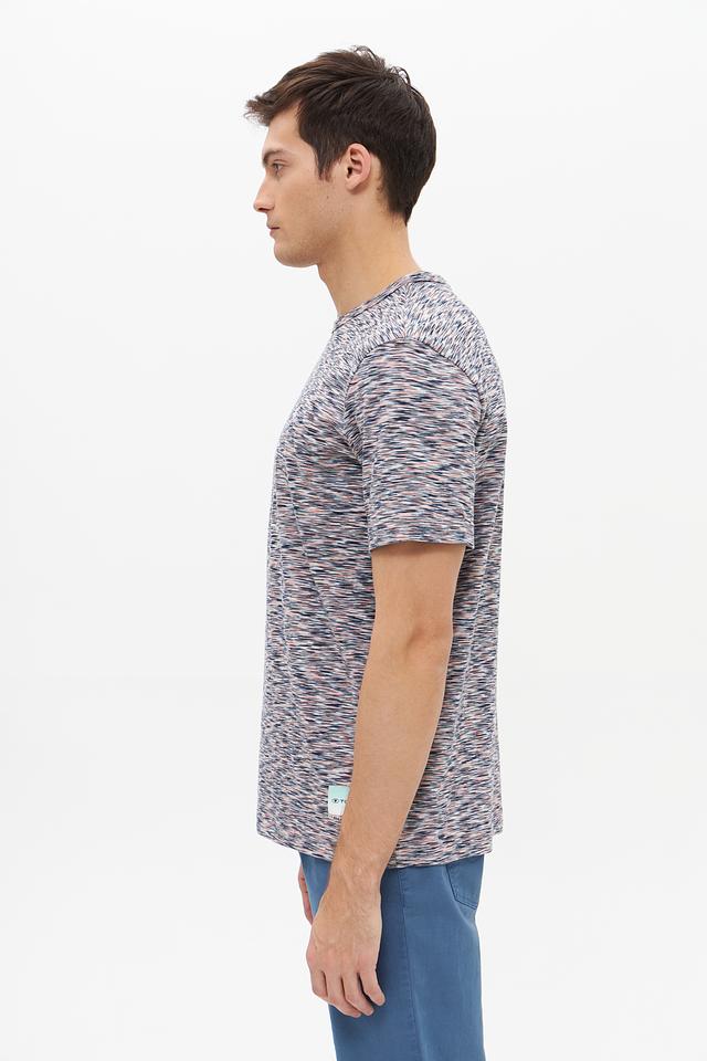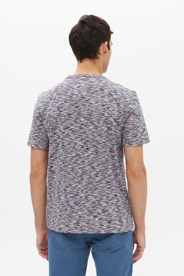 Особенностью данной модели является её уникальный меланжевый рисунок, сочетающий в себе различные оттенки серого, синего и розового. Это придает футболке стильный и современный вид.