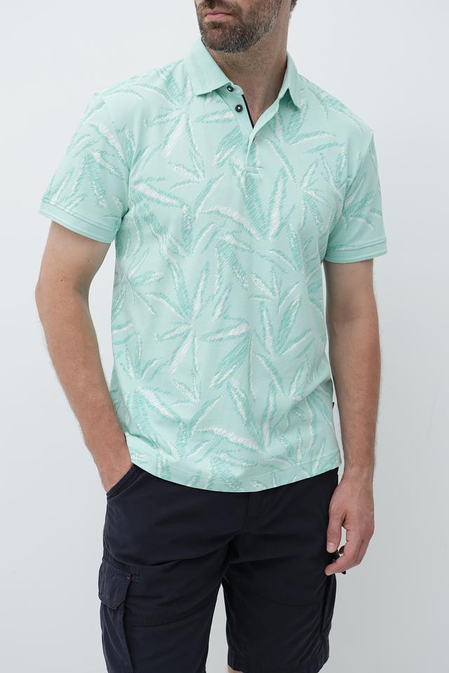Это мужское поло от Tom Tailor выполнено в нежном мятном цвете и украшено оригинальным тропическим принтом, добавляющим образу свежесть и легкость.