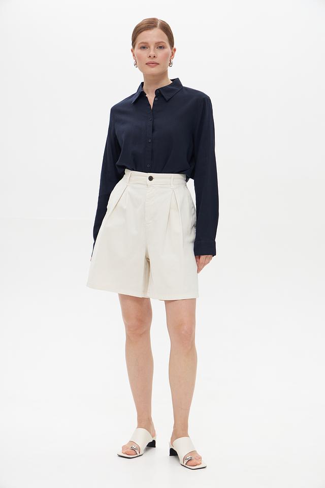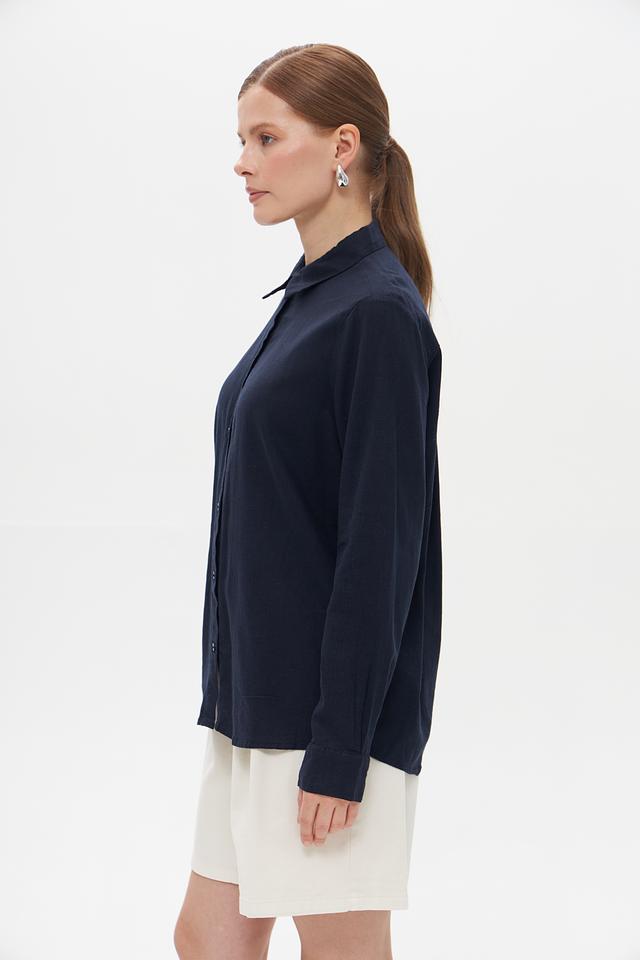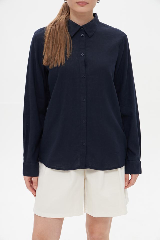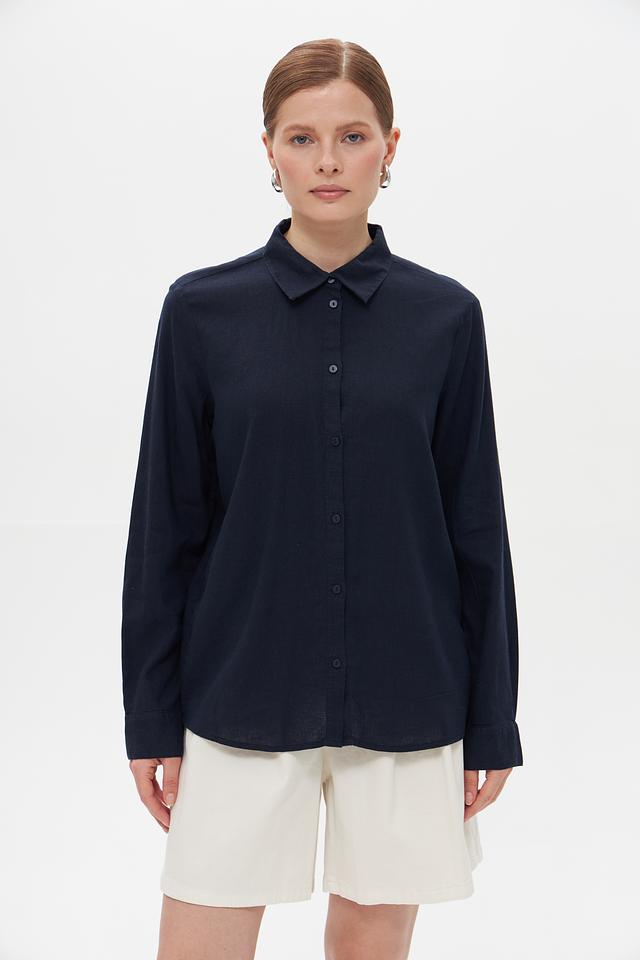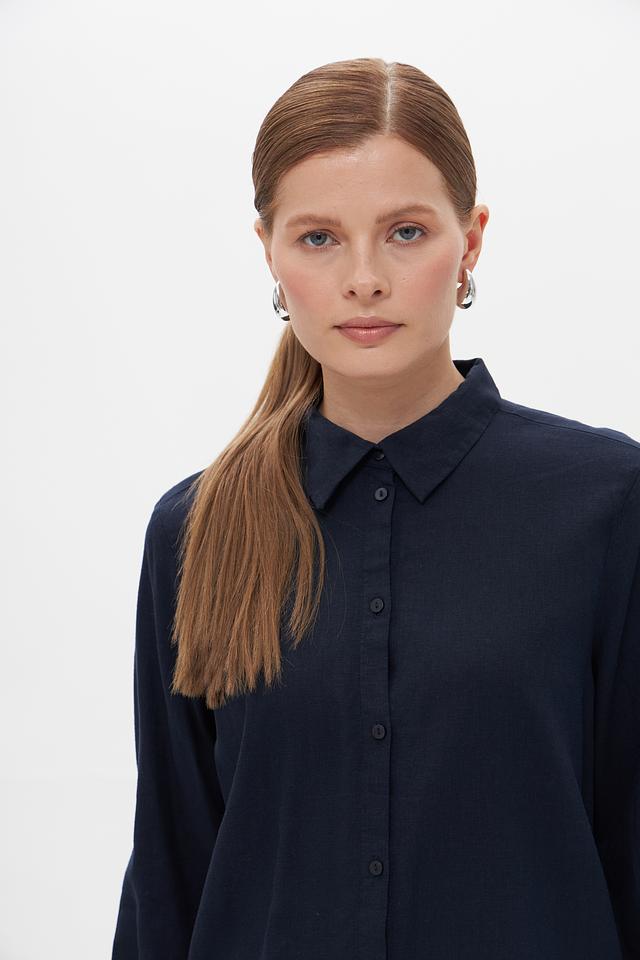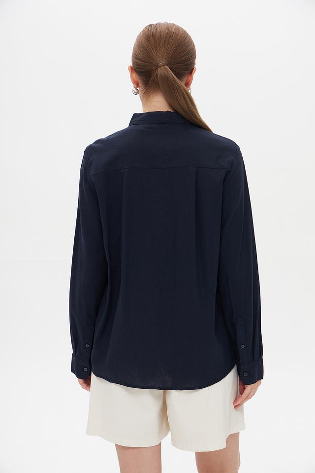 Классическая блуза Tom Tailor темно-синего цвета, выполнена из натурального льна с вискозой. Прямой крой и длинный рукав делают ее универсальным элементом гардероба. Состав: лен 55%, вискоза 45%