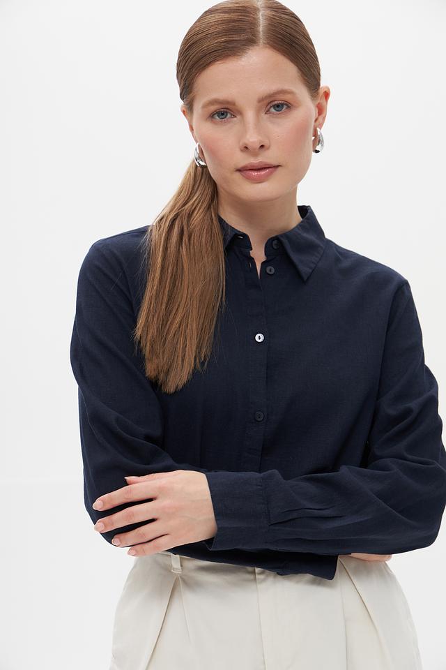 Темно-синий цвет блузы универсален и легко сочетается с различными элементами гардероба. Застежка на пуговицы по всей длине позволяет регулировать степень прилегания. Длинные рукава с манжетами завершают классический образ.