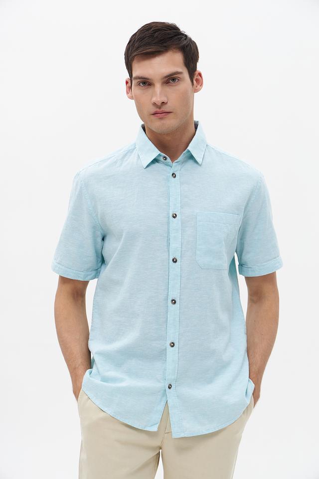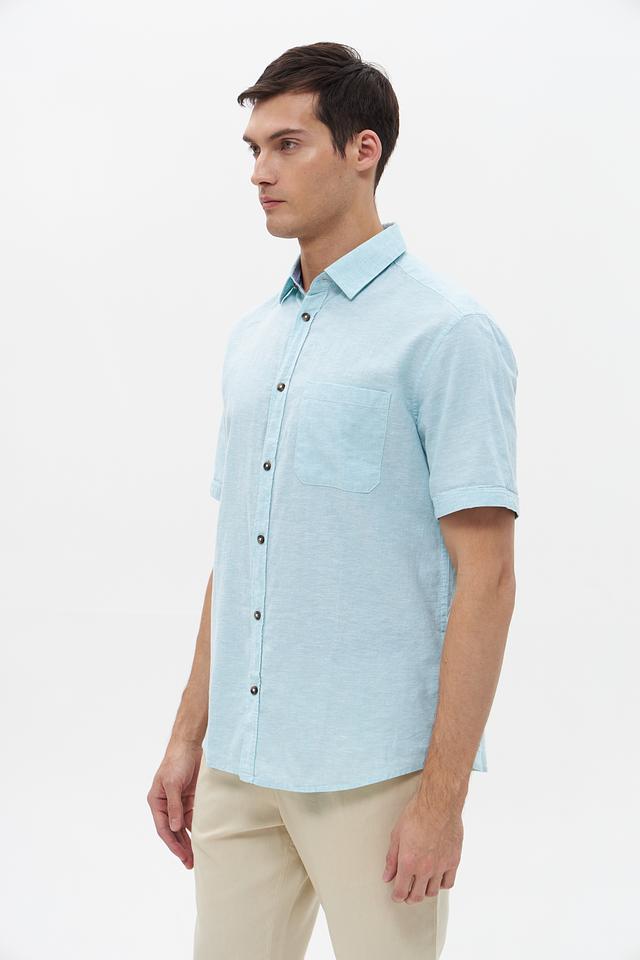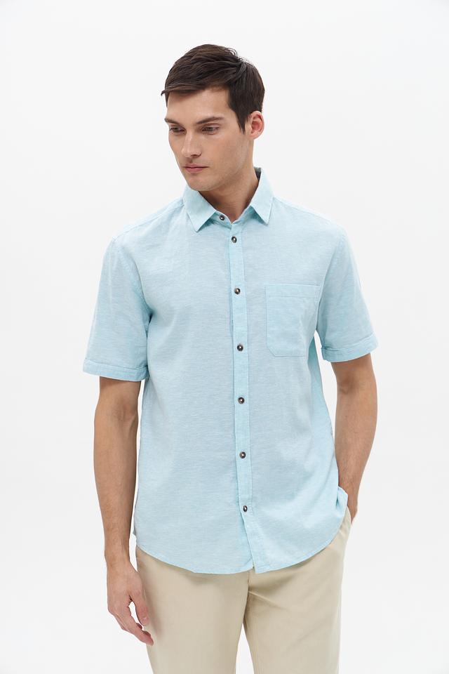 Рубашка имеет классический крой с короткими рукавами и стандартным воротником. Мятный цвет придает образу свежесть и легкость, а однотонный дизайн позволяет сочетать рубашку с различными брюками и шортами.