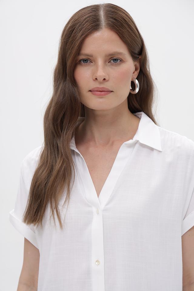 Классический крой с V-образным вырезом и короткими рукавами, оформленными манжетами с пуговицами, придает блузе элегантный и универсальный вид. Она легко сочетается с джинсами, брюками или юбками, позволяя создавать разнообразные образы.