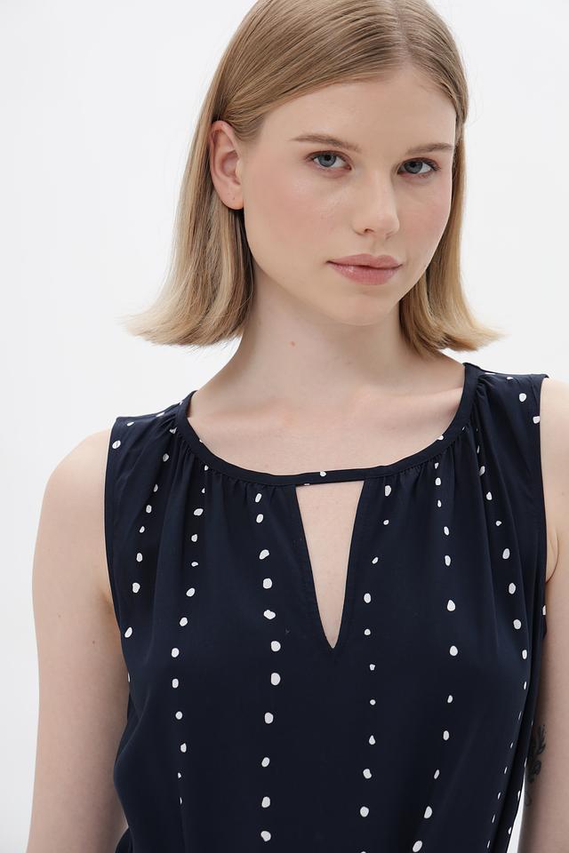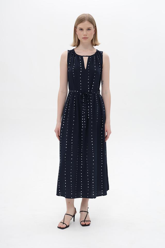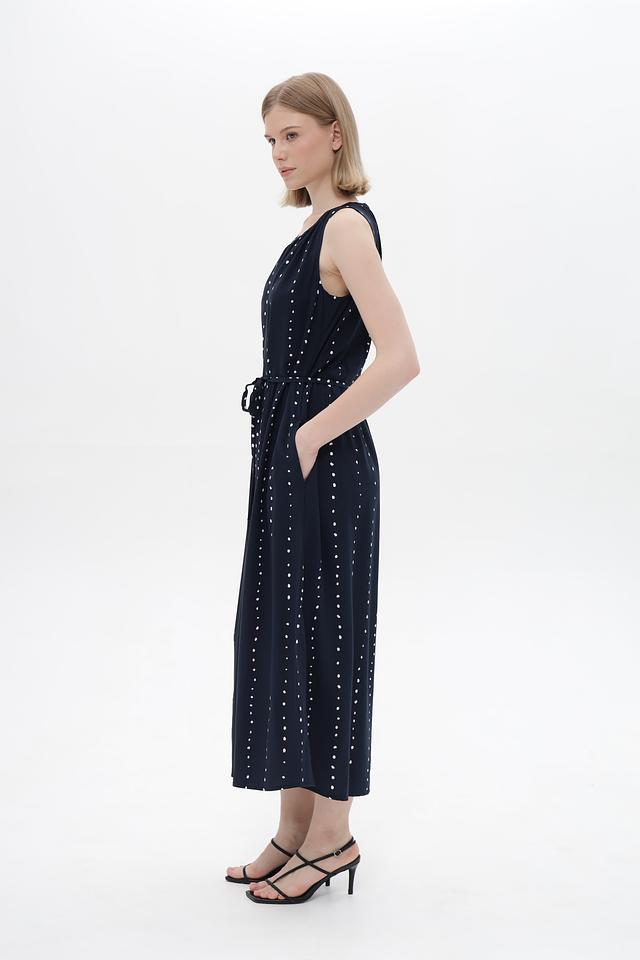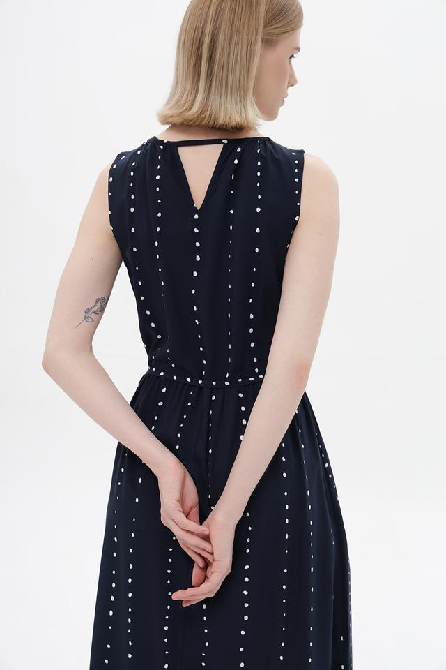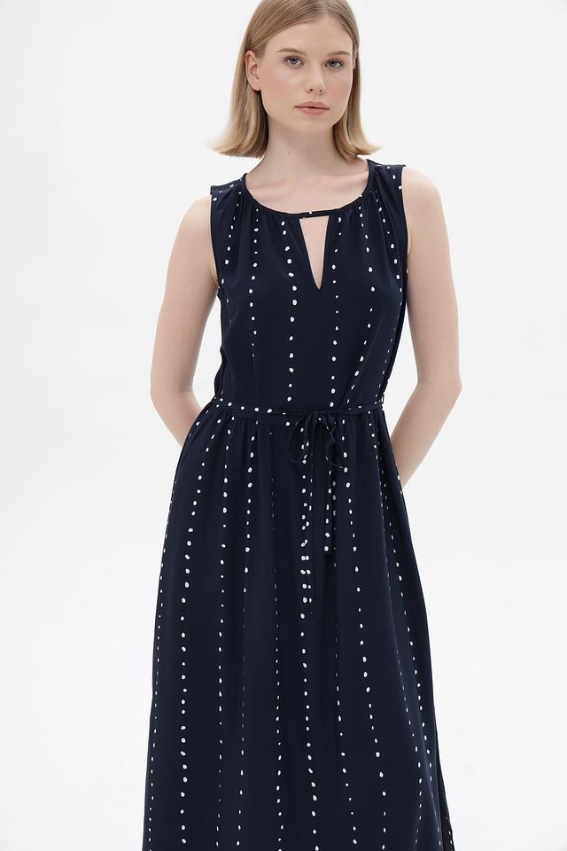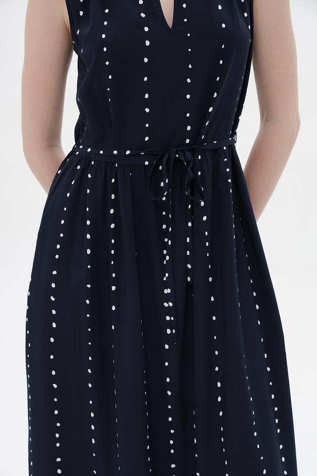 Платье Tom Tailor темно-синего цвета, украшенное белым горошком, станет отличным выбором для создания стильного и комфортного образа. Модель имеет длину миди, свободный крой и регулируемый пояс. Состав: вискоза 70%, лиоцел 30%