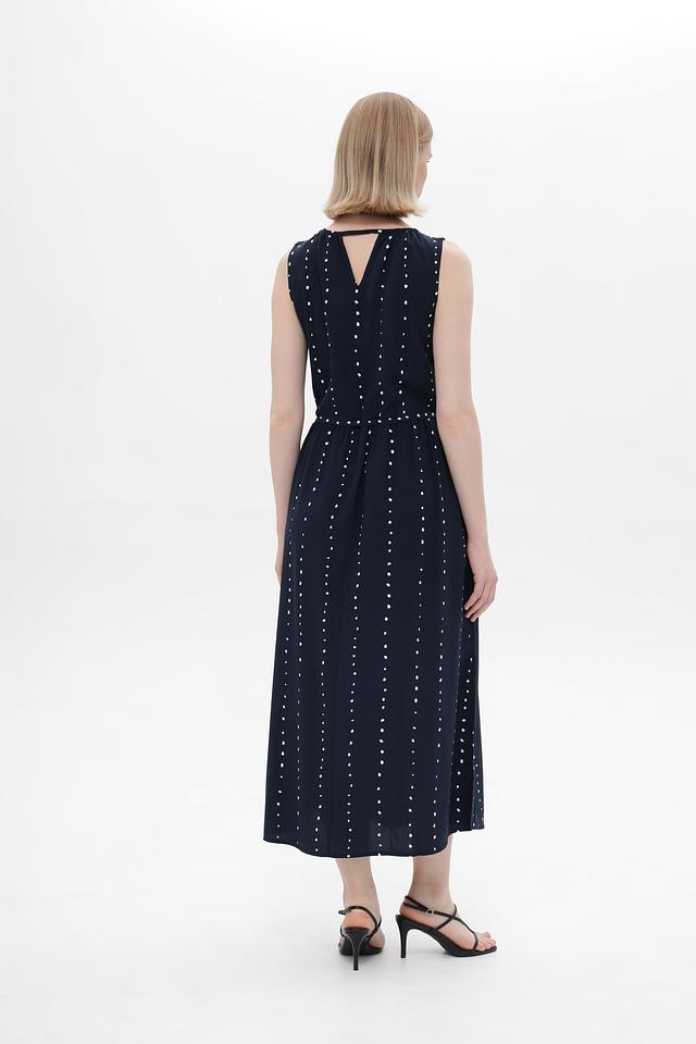 Платье имеет прямой силуэт, длину миди и короткие рукава. Особенностью модели является V-образный вырез горловины с небольшой декоративной вставкой и завязки на плечах. Платье украшено мелким белым горошком по всей поверхности ткани, что придает ему игривый и женственный вид.