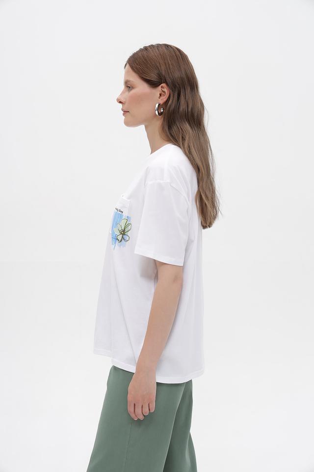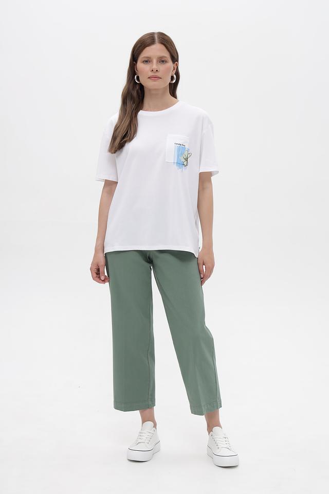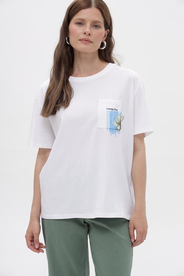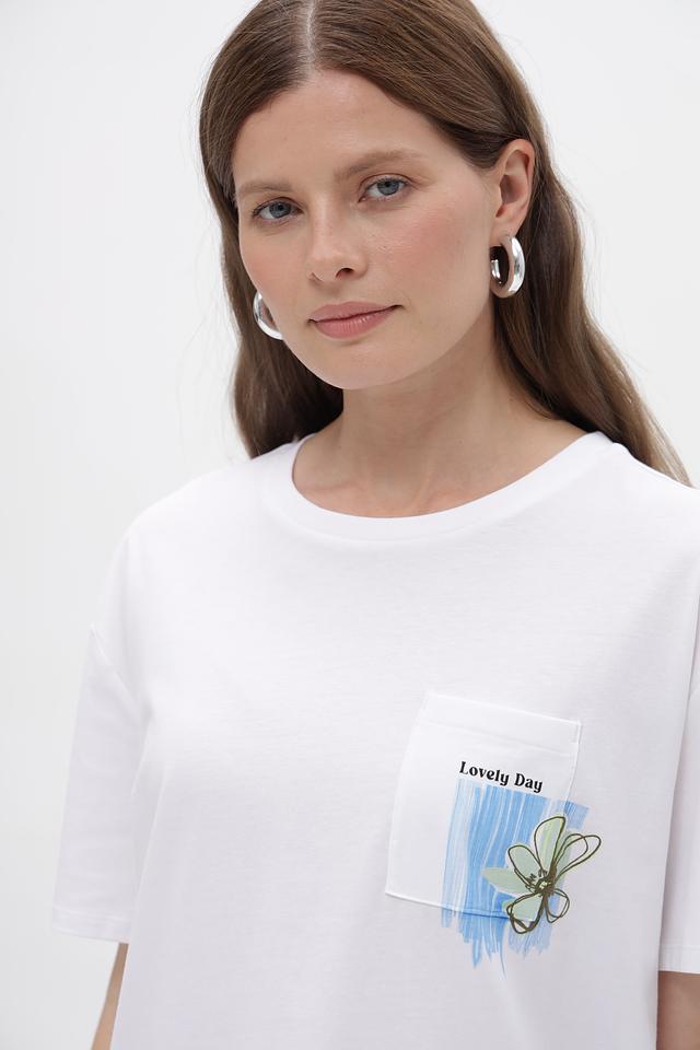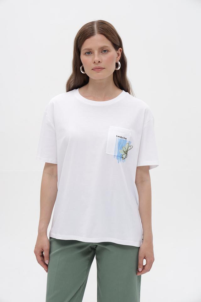 Особенностью данной модели является оригинальный принт на нагрудном кармане, который добавляет ей индивидуальности и стиля. Футболка имеет свободный крой, что делает ее удобной для повседневной носки.