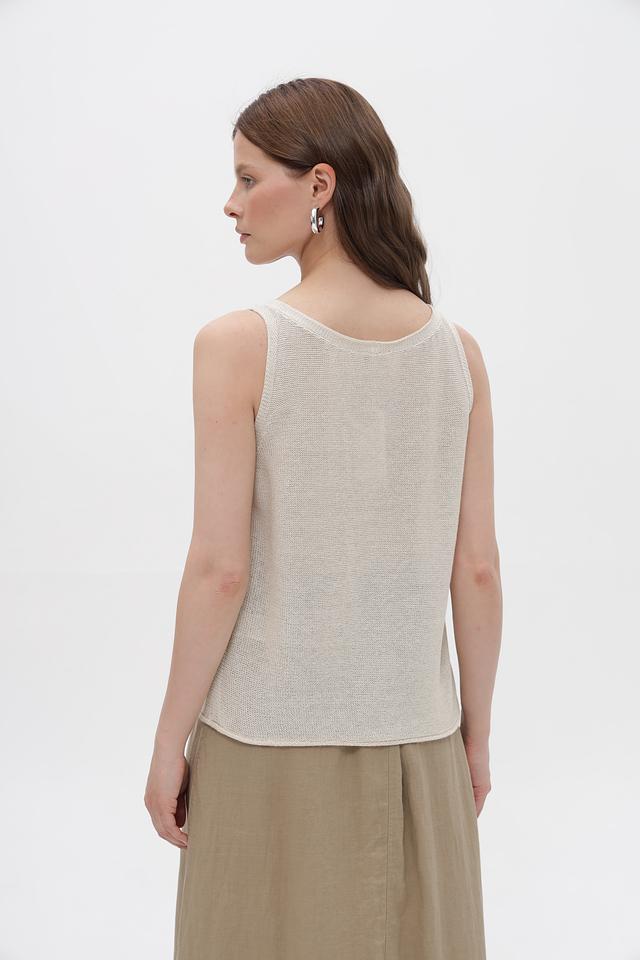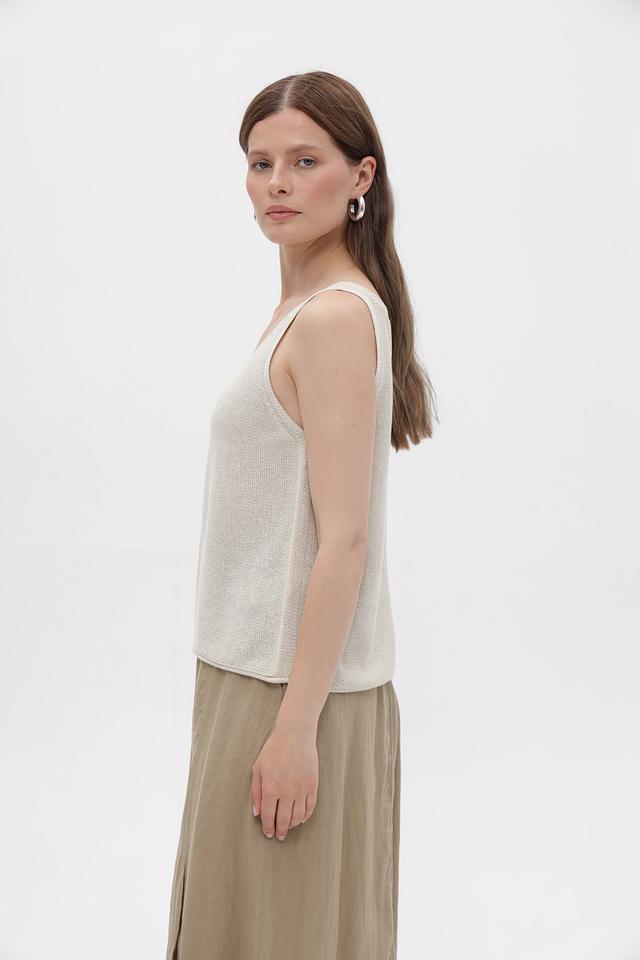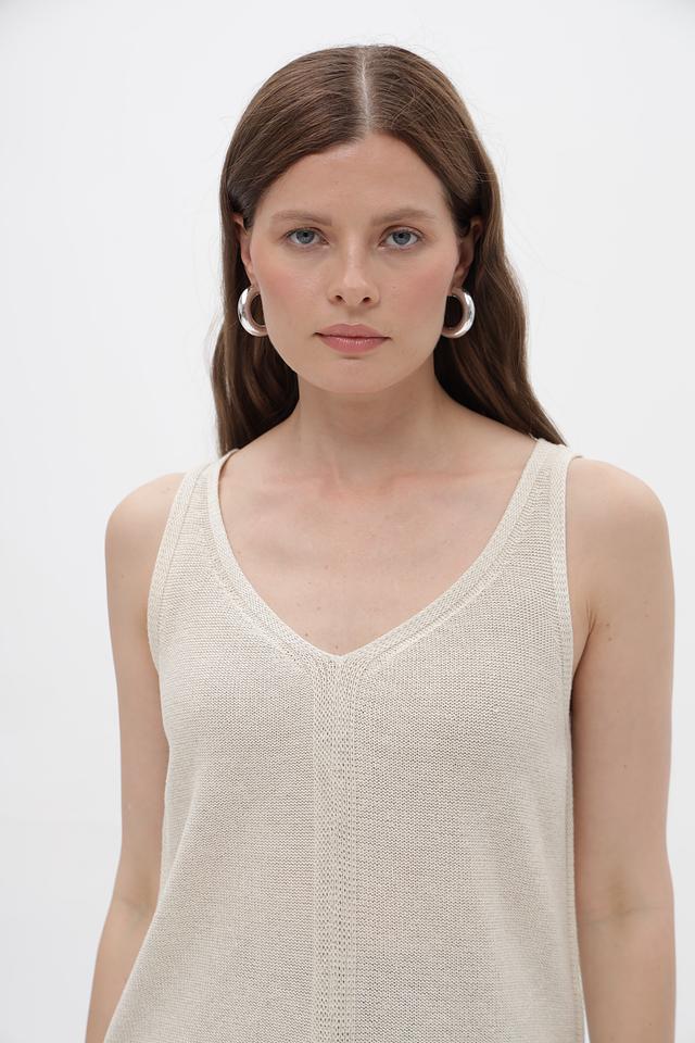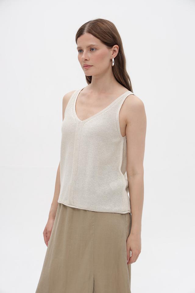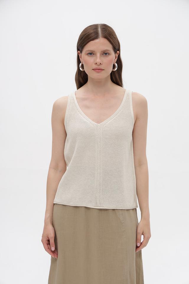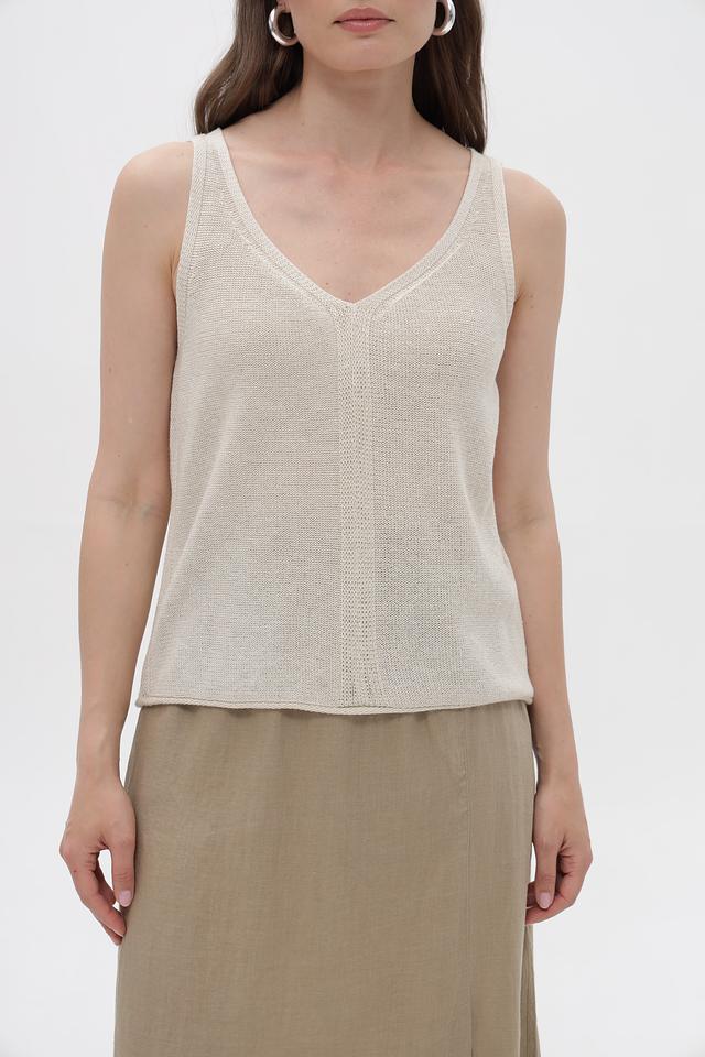 Топ имеет классический крой с V-образным вырезом и тонкими бретелями. Изготовлен из смеси хлопка, полиэстера и металлизированной нити, что придает ему легкий блеск и приятную текстуру. Состав ткани обеспечивает комфорт при носке и простоту в уходе.