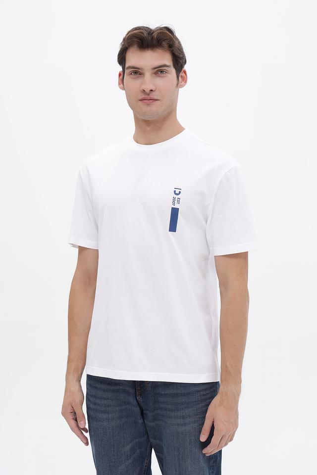 Футболка имеет прямой крой и классический круглый вырез горловины. На груди расположен небольшой логотип и вертикальная полоса в сине-белой гамме, добавляющие акцент. Задняя часть футболки украшена крупным принтом с абстрактным рисунком и надписями.