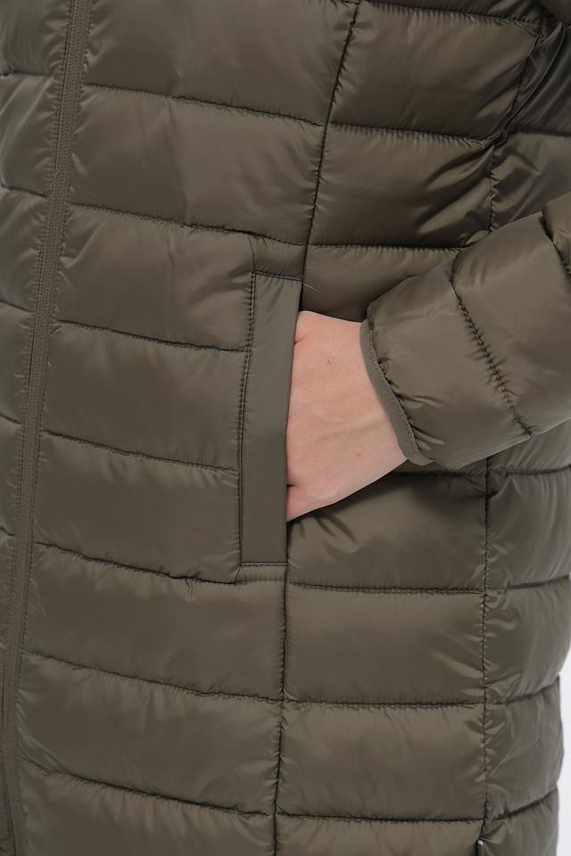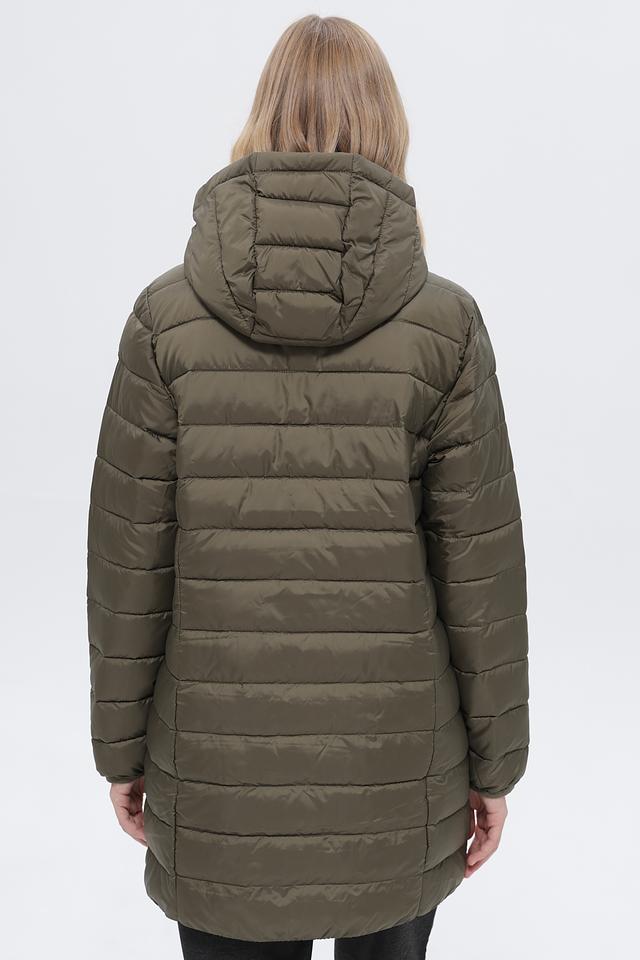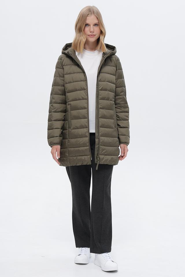 Пальто имеет стеганую структуру, капюшон и застегивается на молнию по всей длине. Два боковых кармана обеспечивают удобство хранения мелочей. Длина пальто – до середины бедра, что делает его подходящим для повседневной носки.