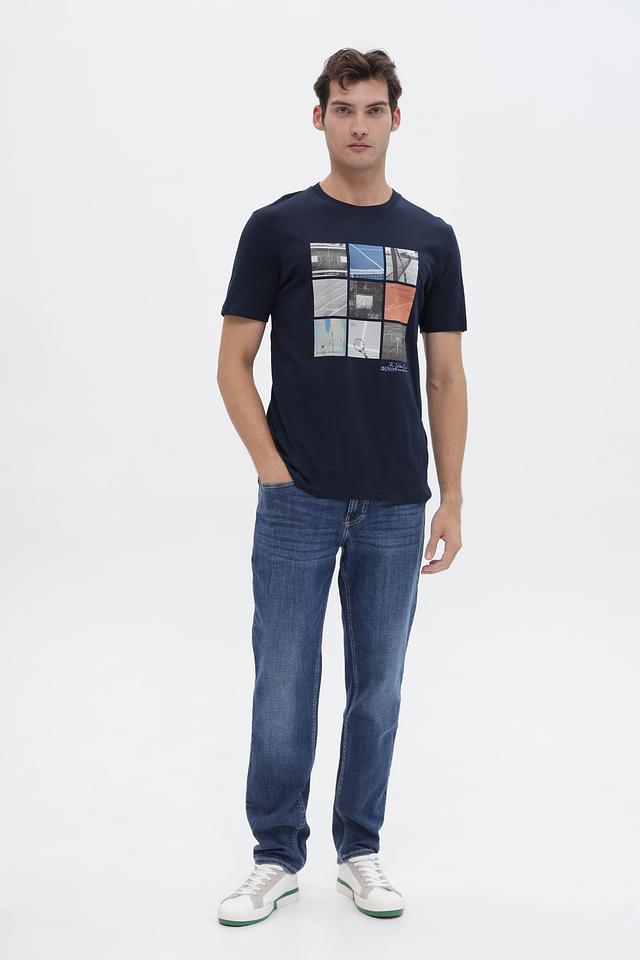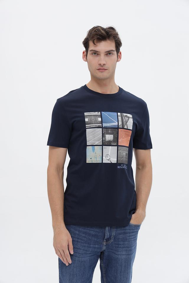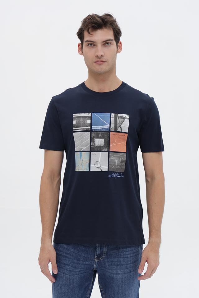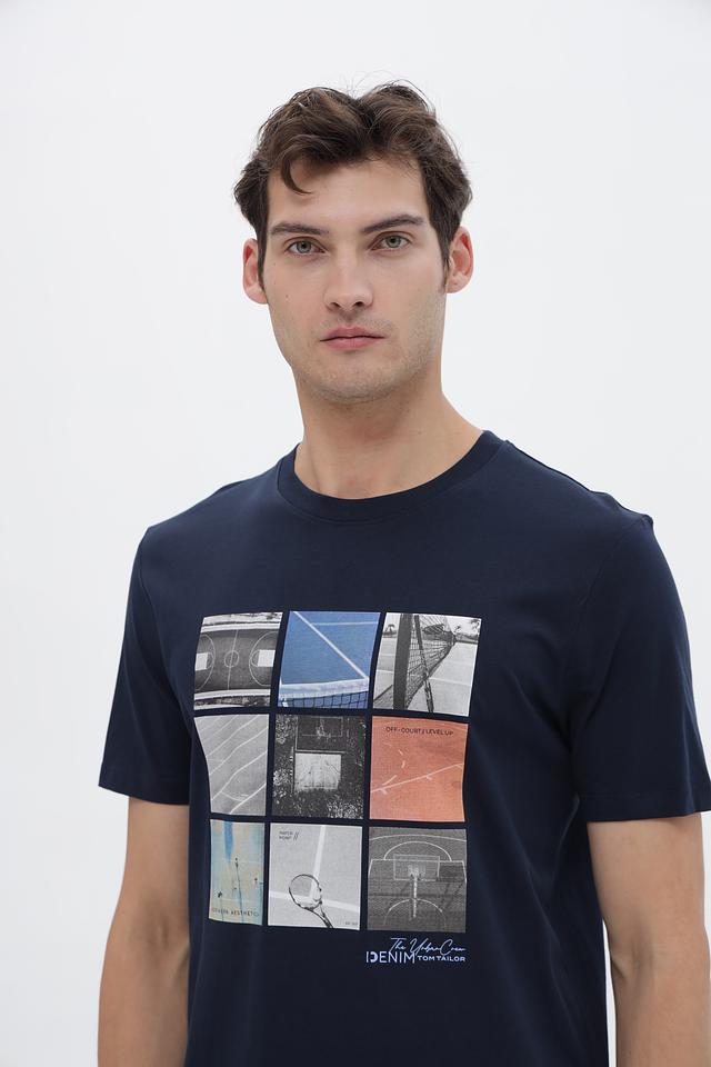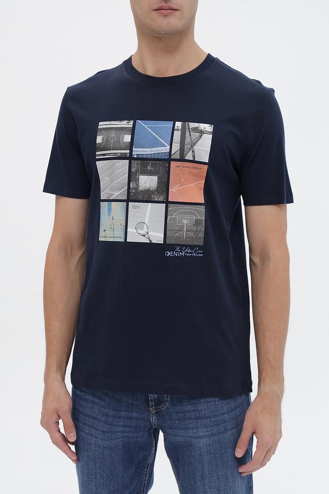 Мужская футболка Tom Tailor denim синего цвета с оригинальным принтом в виде коллажа из изображений спортивных площадок. Изготовлена из 100% хлопка, обеспечивающего комфорт и воздухопроницаемость. Состав: хлопок 100%