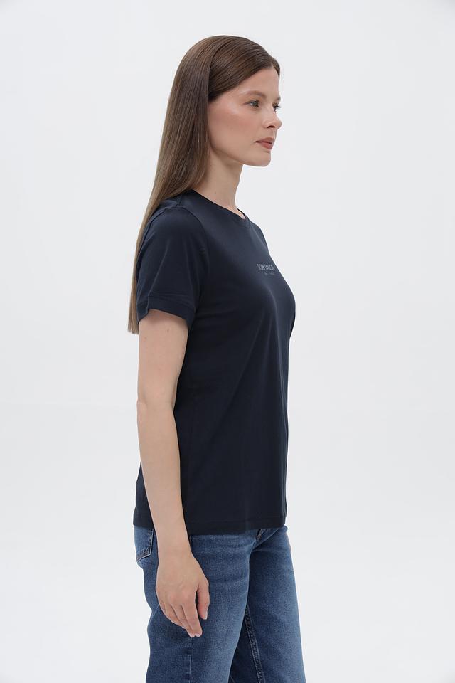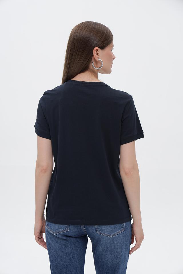 Дизайн футболки лаконичен и универсален: однотонный тёмно-синий цвет и небольшой логотип бренда на груди. Такая футболка легко сочетается с джинсами, шортами, юбками и другими элементами гардероба, позволяя создавать разнообразные образы.