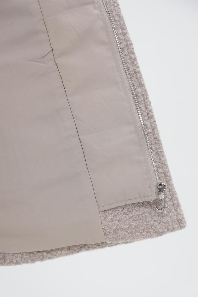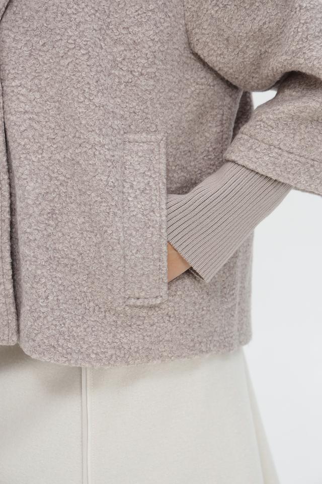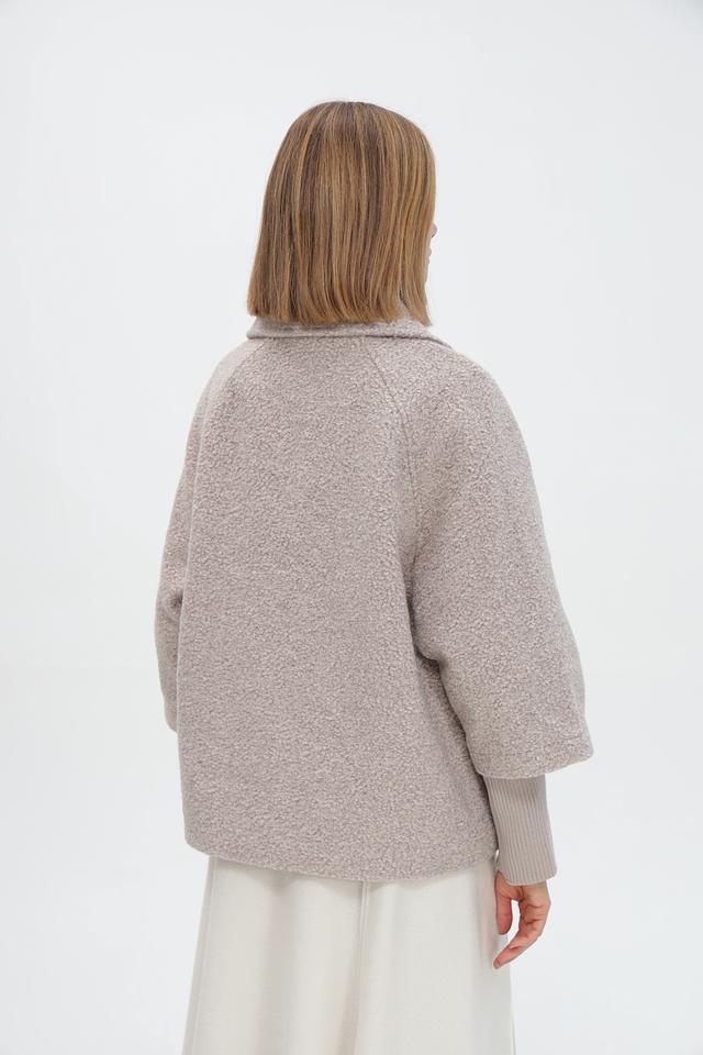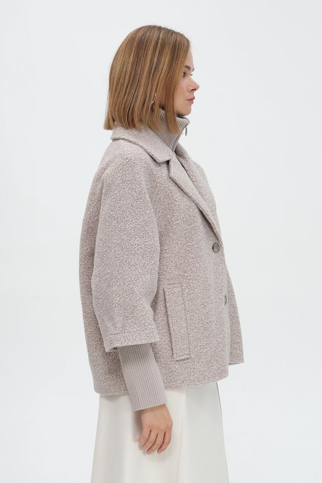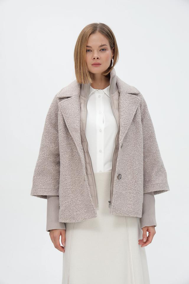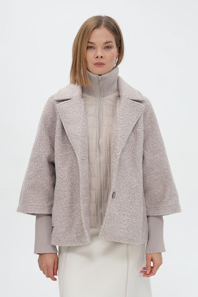 Пальто имеет короткий рукав, который сочетается с вязаными манжетами в тон. Боковые карманы добавляют функциональности.