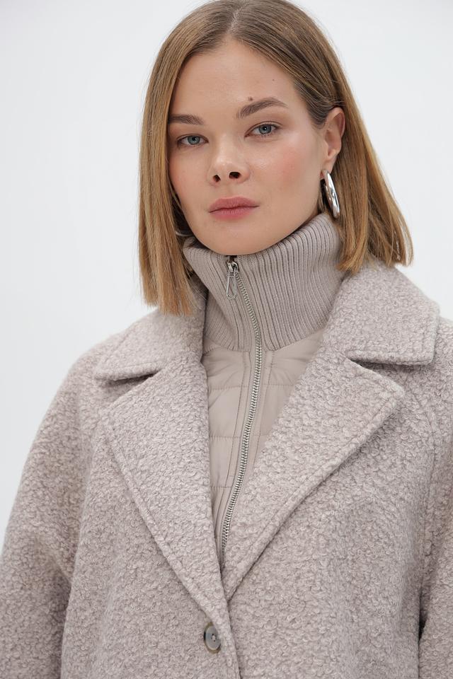Женское пальто от бренда Tom Tailor выполнено из полиэстера, имитирующего фактурный букле. Модель прямого кроя, с отложным воротником и застежкой на пуговицы и молнию.