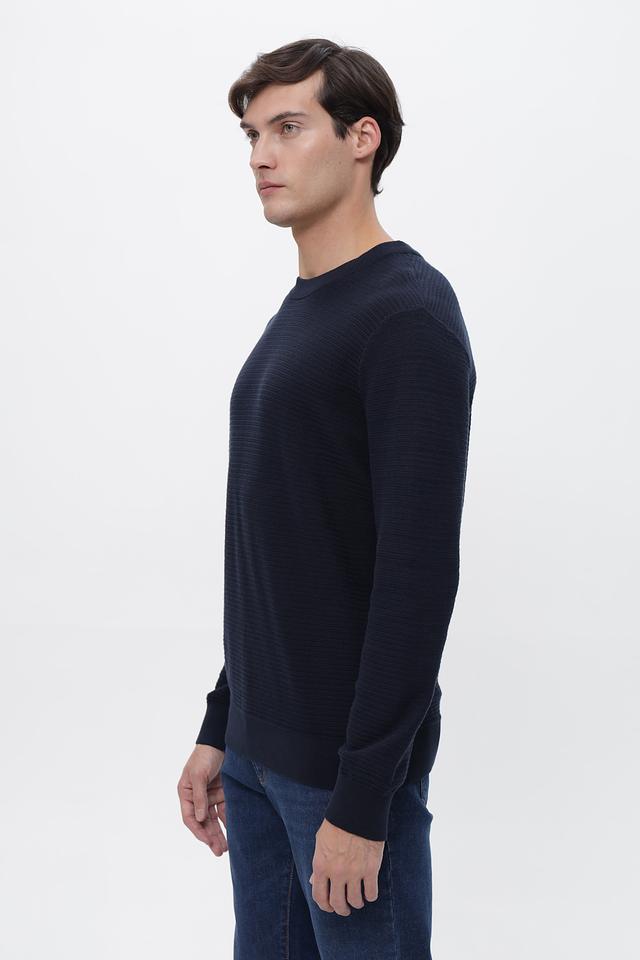 Модель имеет классический крой с круглым вырезом горловины и длинными рукавами. Тёмно-синий цвет делает джемпер универсальным и легко сочетаемым с различными элементами гардероба.