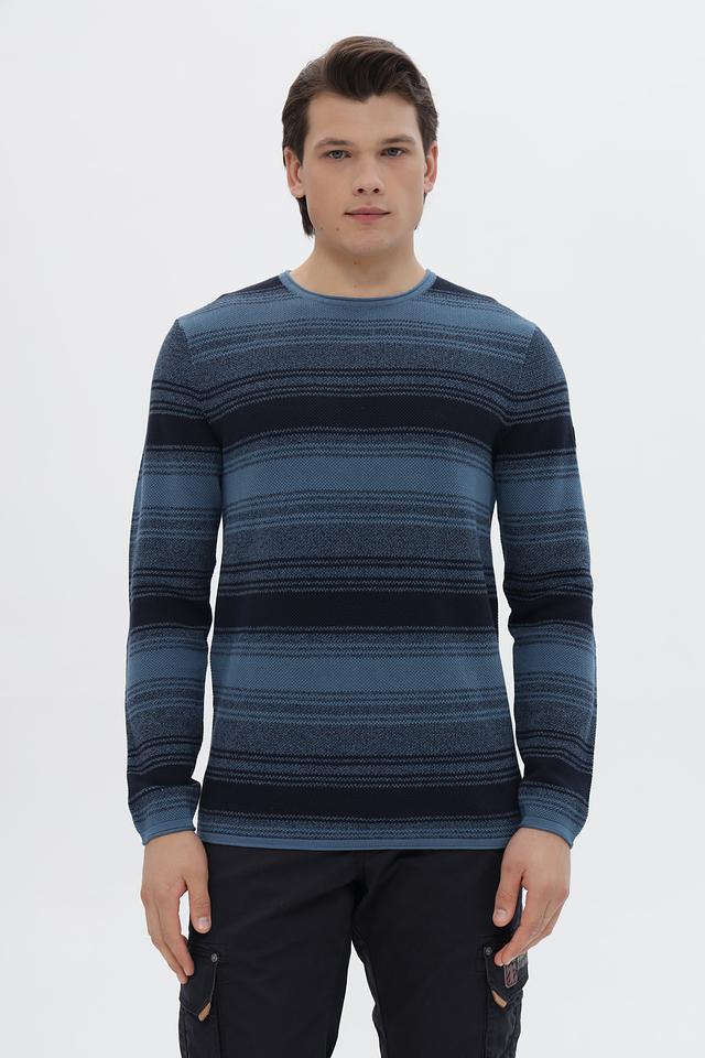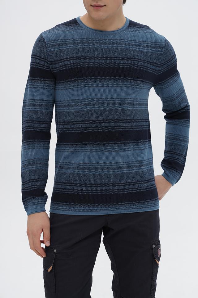 Этот стильный джемпер от Tom Tailor выполнен в классическом крое и украшен горизонтальными полосами синих и тёмно-синих оттенков. Модель имеет круглый вырез горловины и длинные рукава, что делает её универсальной для различных образов.