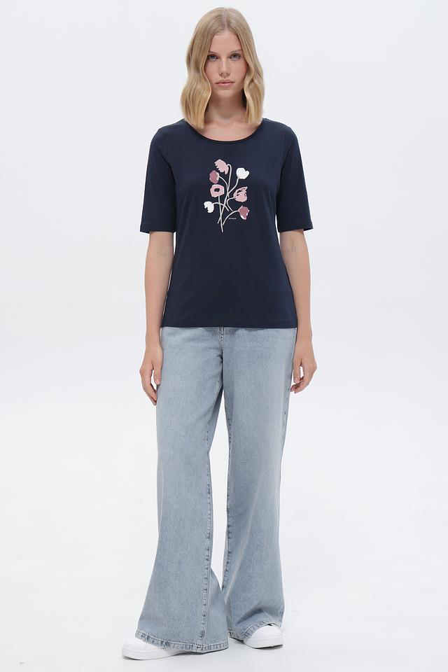 Футболка имеет классический прямой крой и короткий рукав. Основной цвет – темно-синий, который прекрасно сочетается с различными элементами одежды. Главной особенностью модели является цветочный принт, выполненный в нежных розовых и лиловых оттенках, который добавляет образу женственности и легкости.