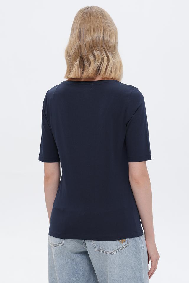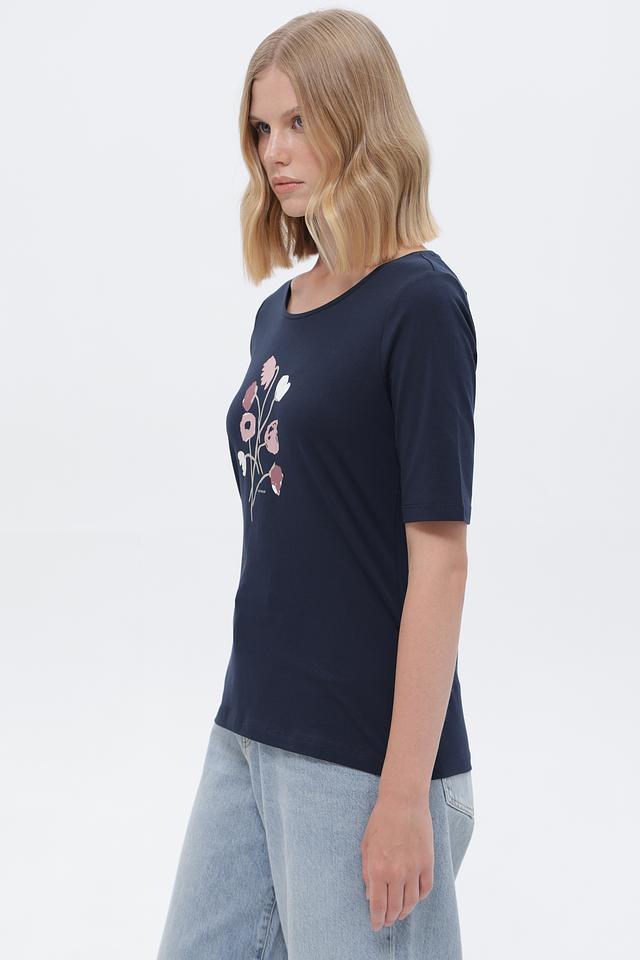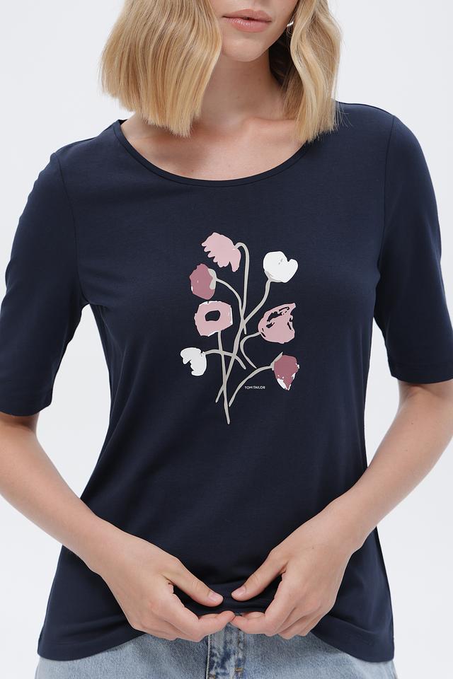 Женская футболка Tom Tailor темно-синего цвета с нежным цветочным принтом. Изготовлена из мягкого хлопка с добавлением эластана для комфорта и свободы движений. Стильный и удобный вариант для повседневного образа. Состав: хлопок 95%, эластан 5%