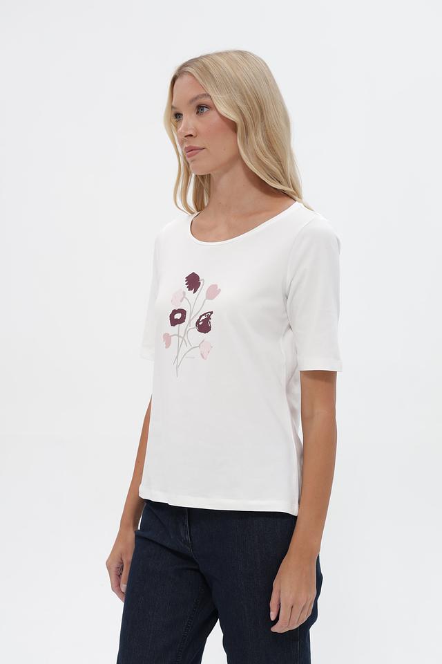 Белая футболка Tom Tailor с цветочным принтом, выполненная из мягкого хлопка с добавлением эластана. Модель имеет округлый вырез горловины и короткие рукава, обеспечивающие комфорт в жаркую погоду. Состав: 95% хлопок, 5% эластан. Состав: хлопок 95%, эластан 5%
