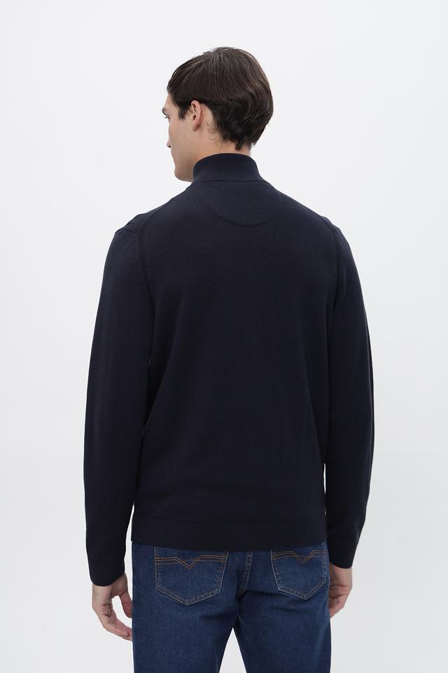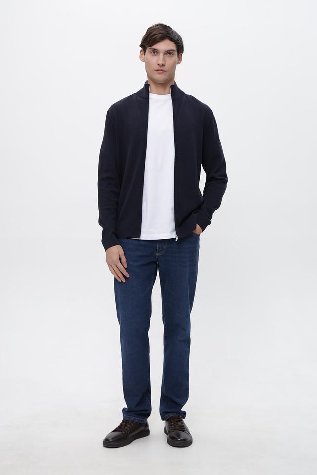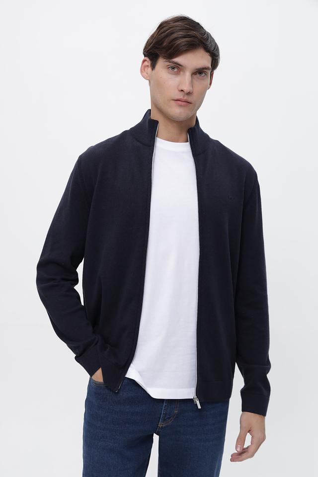 Кардиган имеет классический крой с застёжкой на молнию, что позволяет легко регулировать степень тепла. Тёмно-синий цвет делает его универсальным элементом гардероба, который легко сочетается с различными стилями одежды.