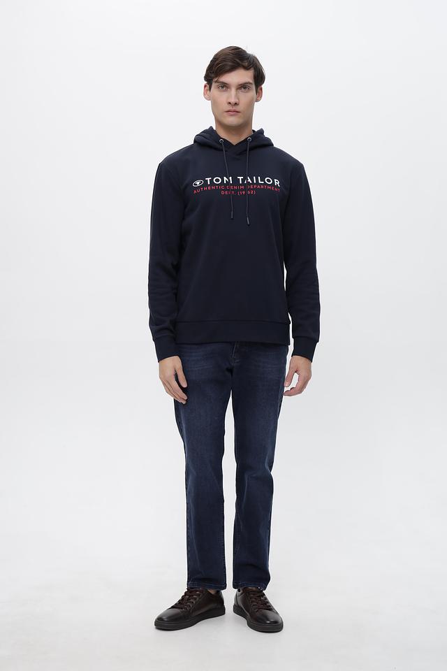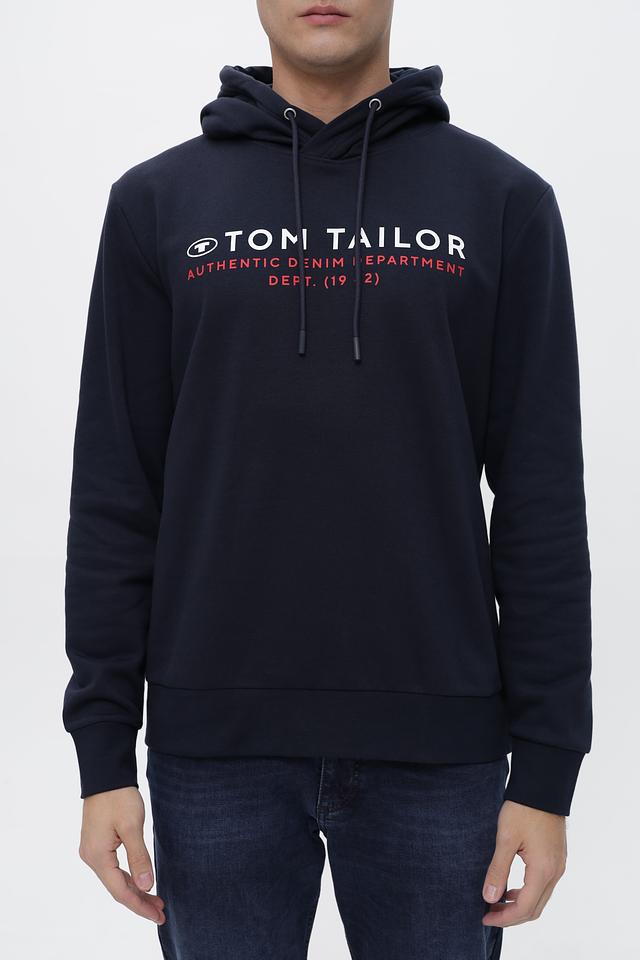 Мужское худи Tom Tailor синего цвета с логотипом бренда и надписью "Authentic Denim Department". Изготовлено из мягкого хлопка с добавлением полиэстера для комфорта и долговечности. Состав: хлопок 70%, полиэстер 30%
