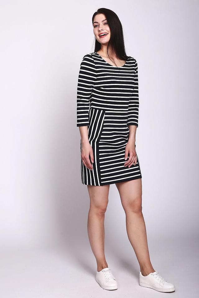 Платье от Tom Tailor в классическую чёрно-белую полоску – идеальный выбор для создания стильного и комфортного образа. Приталенный силуэт и рукава 3/4 подчеркивают фигуру, а эластан в составе обеспечивает удобную посадку. Состав: полиэстер 96%, эластан 4%