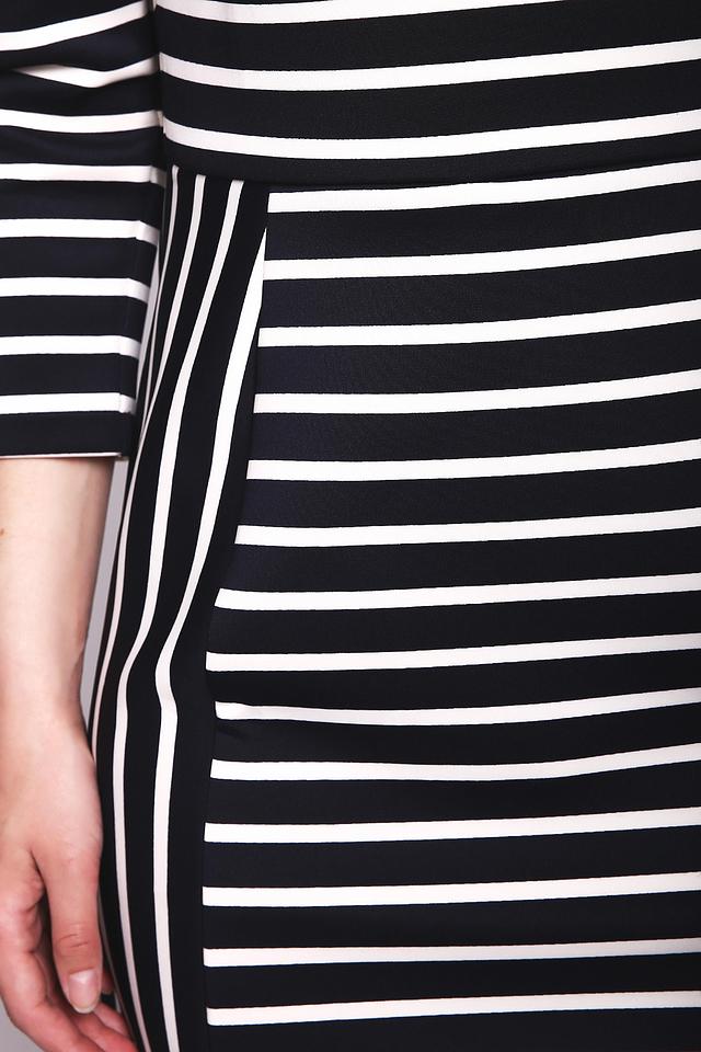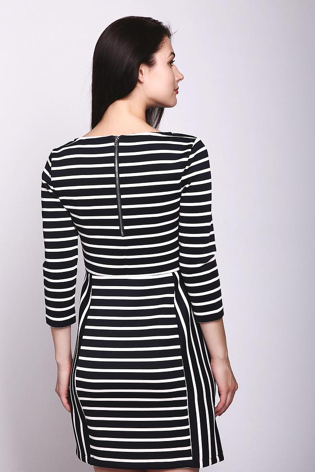 Это приталенное платье от Tom Tailor выполнено в классическом чёрно-белом цвете с полосатым узором. Модель имеет длину мини и рукава три четверти, что делает её подходящей для различных случаев.