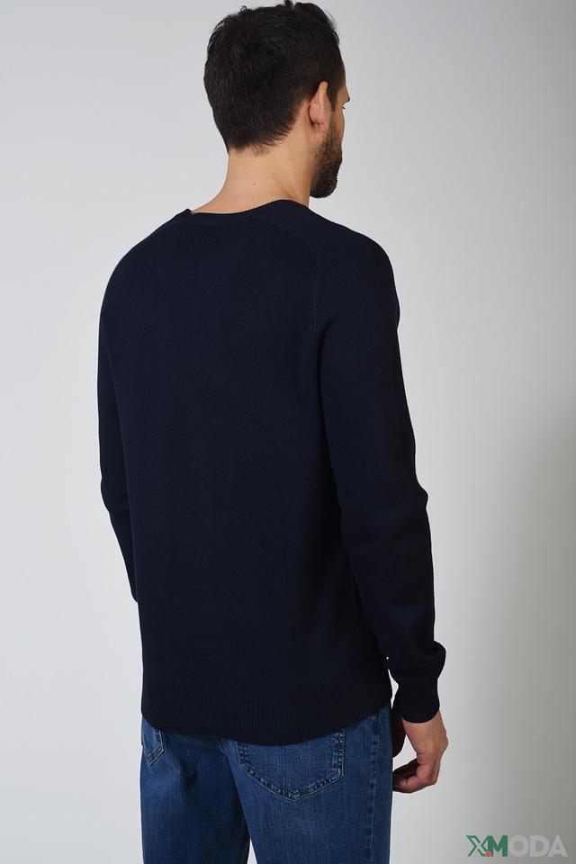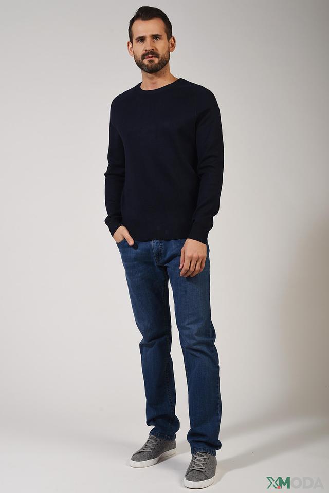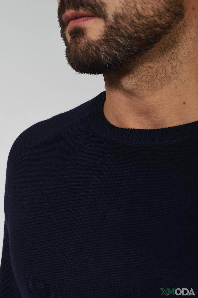 Цвет джемпера – насыщенный тёмно-синий, который легко сочетается с различными элементами одежды. На левой стороне груди расположен небольшой логотип бренда. Состав: 70% вискоза, 30% полиамид.