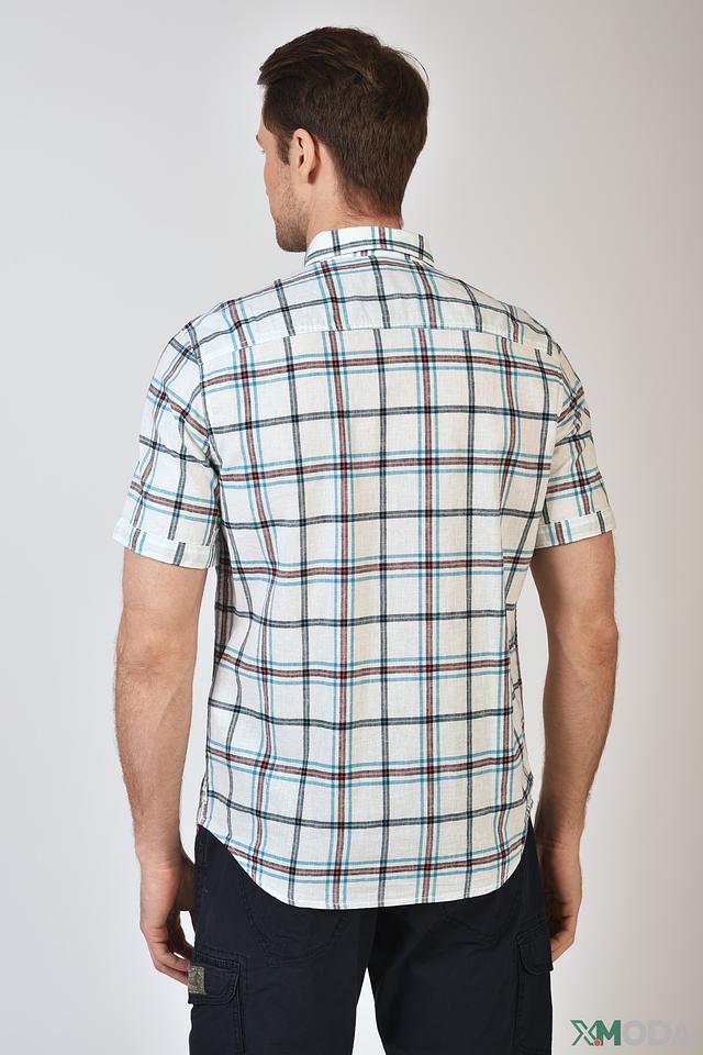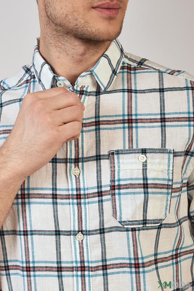 Мужская рубашка Tom Tailor бежевого цвета в клетку с коротким рукавом. Изготовлена из натурального смесового материала, обеспечивающего комфорт и воздухопроницаемость. Отличный выбор для повседневного образа. Состав: лен 55%, хлопок 45%