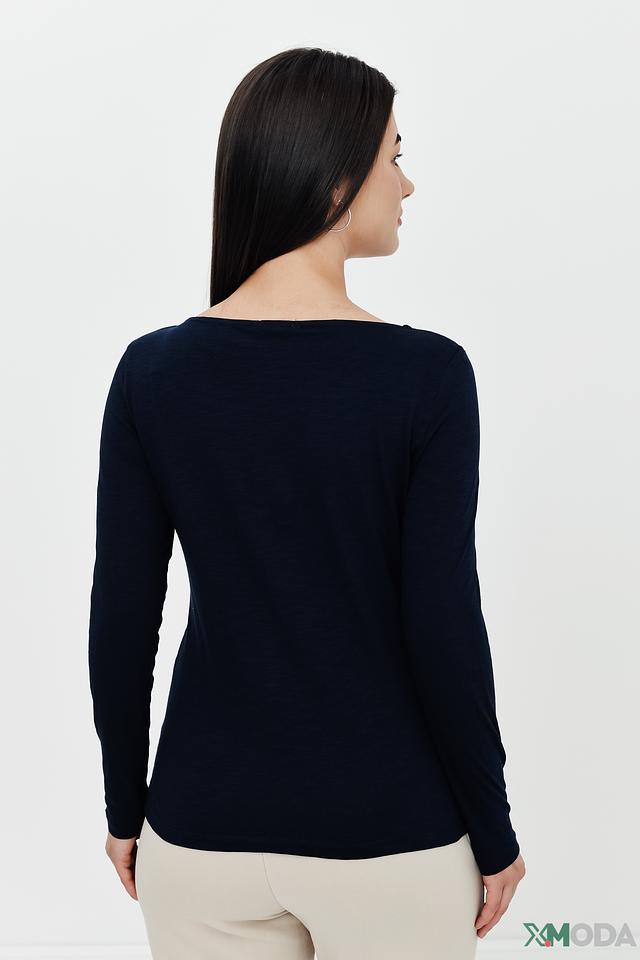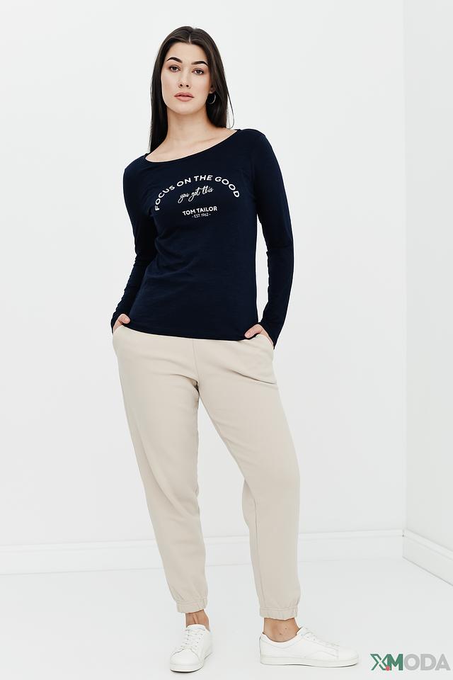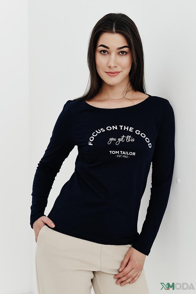 Женский лонгслив Tom Tailor темно-синего цвета с оригинальным принтом "FOCUS ON THE GOOD". Изготовлен из мягкого и приятного к телу хлопка, обеспечивающего комфорт в течение всего дня. Стильное и удобное решение для повседневного гардероба. Состав: хлопок 100%